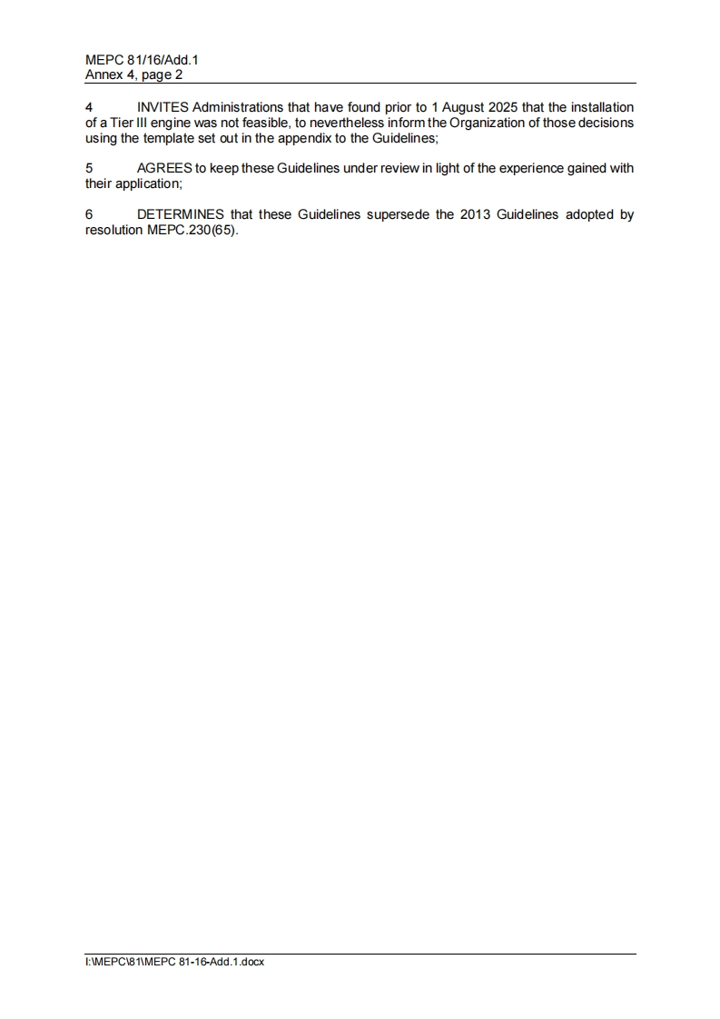 MEPC 81/16/Add.1Annex 4,page 1ANNEX 4RESOLUTION MEPC.386(81)(adopted on 22 March 2024)2024 GUIDELINES AS REQUIRED BY REGULATION 13.2.2 OF MARPOL ANNEX VIIN RESPECT OF NON-IDENTICAL REPLACEMENT ENGINES NOT REQUIRED TOMEET THE TIER III LIMITTHE MARINE ENVIRONMENT PROTECTION COMMITTEE.RECALLING Article 38(a)of the Convention on the International Maritime Organizationconcerning the functions of the Marine Environment Protection Committee conferred upon itby international conventions for the prevention and control of marine pollution,RECALLING ALSO that,at its fifty-eighth session,it adopted,by resolution MEPC.176(58),arevised MARPOL Annex VI(hereinafter referred to as "MARPOL Annex VI")which significantlystrengthens the emission limits for nitrogen oxides(NOx)in light of technological improvementsand implementation experience,NOTING that regulation 13.2.2 of MARPOL Annex VI specifies which NOx emission standardshall be applied when a marine diesel engine is replaced with a non-identical marine dieselengine,RECOGNIZING the need to develop guidelines to set forth criteria for when it is not possiblefor a replacement engine to meet the standards in regulation 13.5.1.1 (Tier Ill),RECALLING that,at its sixty-fifth session,it adopted,by resolution MEPC.230(65),the 2013Guidelines as required by regulation 13.2.2 of MARPOL Annex VI in respect of non-identicalreplacement engines not required to meet the Tier Ill limit (hereinafter referred to as the"2013 Guidelines"),RECOGNIZING the need to update the 2013 Guidelines,HAVING CONSIDERED,at its eighty-first session,the draft 2024 Guidelines as required byregulation 13.2.2 of MARPOL Annex VI in respect of non-identical replacement engines notreguired to meet the Tier/ll limit,prepared by the Sub-Committee on Pollution Prevention andResponse at its tenth session,ADOPTS the 2024 Guidelines as required by regulation 13.2.2 of MARPOL Annex VIin respect of non-identical replacement engines not required to meet the Tier Ill limit,as setout in the annex to the present resolution;2INVITES Administrations to take the annexed Guidelines into account whenconsidering whether the installation of a Tier Ill marine diesel engine is not feasible in the caseof a non-identical marine diesel engine;REQUESTS the Parties to MARPOL Annex VI and other Member Govemments tobring the annexed Guidelines to the attention of shipowners,ship operators,shipbuilders,marine diesel engine manufacturers and any other interested groups;I:MEPC81MEPC 81-16-Add.1.docx