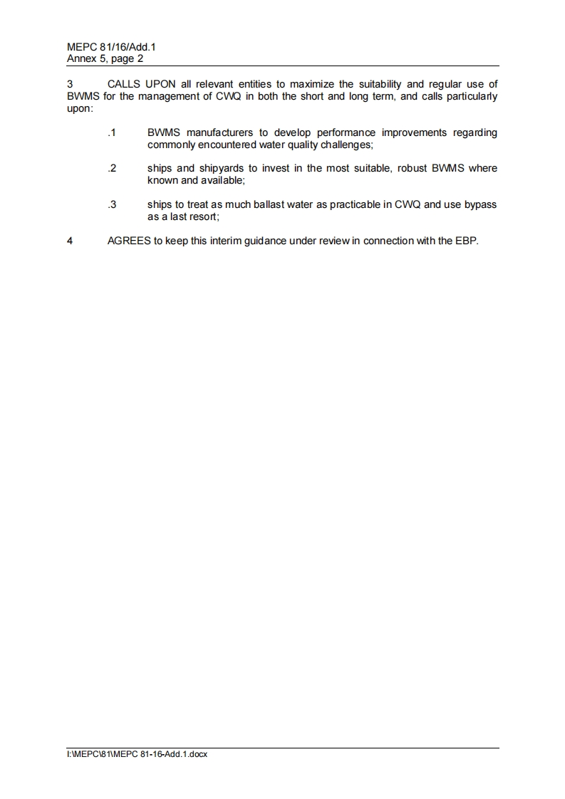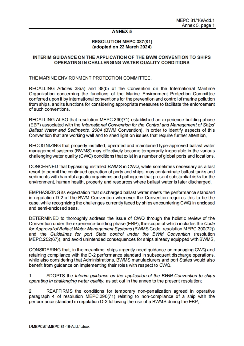 MEPC 81/16/Add.1Annex 5,page 1ANNEX 5RESOLUTION MEPC.387(81)(adopted on 22 March 2024)INTERIM GUIDANCE ON THE APPLICATION OF THE BWM CONVENTION TO SHIPSOPERATING IN CHALLENGING WATER QUALITY CONDITIONSTHE MARINE ENVIRONMENT PROTECTION COMMITTEE,RECALLING Articles 38(a)and 38(b)of the Convention on the International MaritimeOrganization concerning the functions of the Marine Environment Protection Committeeconferred upon it by international conventions for the prevention and control of marine pollutionfrom ships,and its functions for considering appropriate measures to facilitate the enforcementof such conventions,RECALLING ALSO that resolution MEPC.290(71)established an experience-building phase(EBP)associated with the International Convention for the Control and Management of Ships'Ballast Water and Sediments,2004(BWM Convention),in order to identify aspects of thisConvention that are working well and to shed light on issues that require further attention,RECOGNIZING that properly installed,operated and maintained type-approved ballast watermanagement systems(BWMS)may effectively become temporarily inoperable in the variouschallenging water quality(CWQ)conditions that exist in a number of global ports and locations,CONCERNED that bypassing installed BWMS in CWQ,while sometimes necessary as a lastresort to pemit the continued operation of ports and ships,may contaminate ballast tanks andsediments with harmful aquatic organisms and pathogens that present substantial risks for theenvironment,human health,property and resources where ballast water is later discharged,EMPHASIZING its expectation that discharged ballast water meets the performance standardin regulation D-2 of the BWM Convention whenever the Convention requires this to be thecase,while recognizing the challenges currently faced by ships encountering CWQ in enclosedand semi-enclosed seas,DETERMINED to thoroughly address the issue of CWQ through the holistic review of theConvention under the experience-building phase(EBP),the scope of which includes the Codefor Approvalof Ballast Water Management Systems(BWMS Code,resolution MEPC.300(72))and the Guidelines for port State control under the BWM Convention (resolutionMEPC.252(67)),and avoid unintended consequences for ships already equipped with BWMS,CONSIDERING that,in the meantime,ships urgently need guidance on managing CWQ andretaining compliance with the D-2 performance standard in subsequent discharge operations,while also considering that Administrations,BWMS manufacturers and port States would alsobenefit from guidance on implementing their roles with respect to CWQ,ADOPTS the Interim guidance on the application of the BWM Convention to shipsoperating in challenging water quality,as set out in the annex to the present resolution;2REAFFIRMS the conditions for temporary non-penalization agreed in operativeparagraph 4 of resolution MEPC.290(71)relating to non-compliance of a ship with theperformance standard in regulation D-2 following