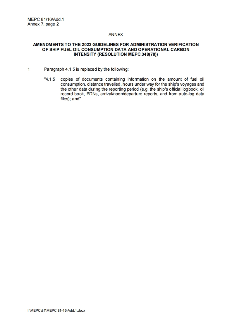 MEPC 81/16/Add.1Annex 7,page 1ANNEX 7RESOLUTION MEPC.389(81)(adopted on 22 March 2024)AMENDMENTS TO THE 2022 GUIDELINES FOR ADMINISTRATION VERIFICATION OFSHIP FUEL OIL CONSUMPTION DATA AND OPERATIONAL CARBONINTENSITY(RESOLUTION MEPC.348(78))THE MARINE ENVIRONMENT PROTECTION COMMITTEE,RECALLING Article 38(a)of the Convention on the International Maritime Organizationconcerning the functions of the Marine Environment Protection Committee conferred upon itby international conventions for the prevention and control of marine pollution from ships,NOTING that regulation 27.7 of MARPOL Annex VI requires that ship fuel oil consumption databe verified according to procedures established by the Administration,taking into accountguidelines developed by the Organization,NOTING ALSO that regulation 28.6 of MARPOL Annex VI specifies that the attained annualoperational Cll shall be documented and verified against the required annual operational Cllto determine operational carbon intensity rating,taking into account the guidelines developedby the Organization,NOTING FURTHER that,at its seventy-eighth session,it adopted,by resolutionMEPC.348(78),the 2022 Guidelines for Administration verification of ship fuel oil consumptiondata and operational carbon intensity,HAVING CONSIDERED,at its eighty-first session,proposed amendments to the 2022Guidelines for Administration verification of ship fuel oil consumption data and operationalcarbon intensity,1ADOPTS amendments to the 2022 Guidelines for Administration verification of shipfuel oil consumption data and operational carbon intensity,as set out in the annex to thepresent resolution;2REQUESTS the Parties to MARPOL Annex VI and other Member Governments tobring the annexed amendments to the attention of masters,seafarers,shipowners,shipoperators and any other interested parties.I:MEPC81MEPC 81-16-Add.1.docx