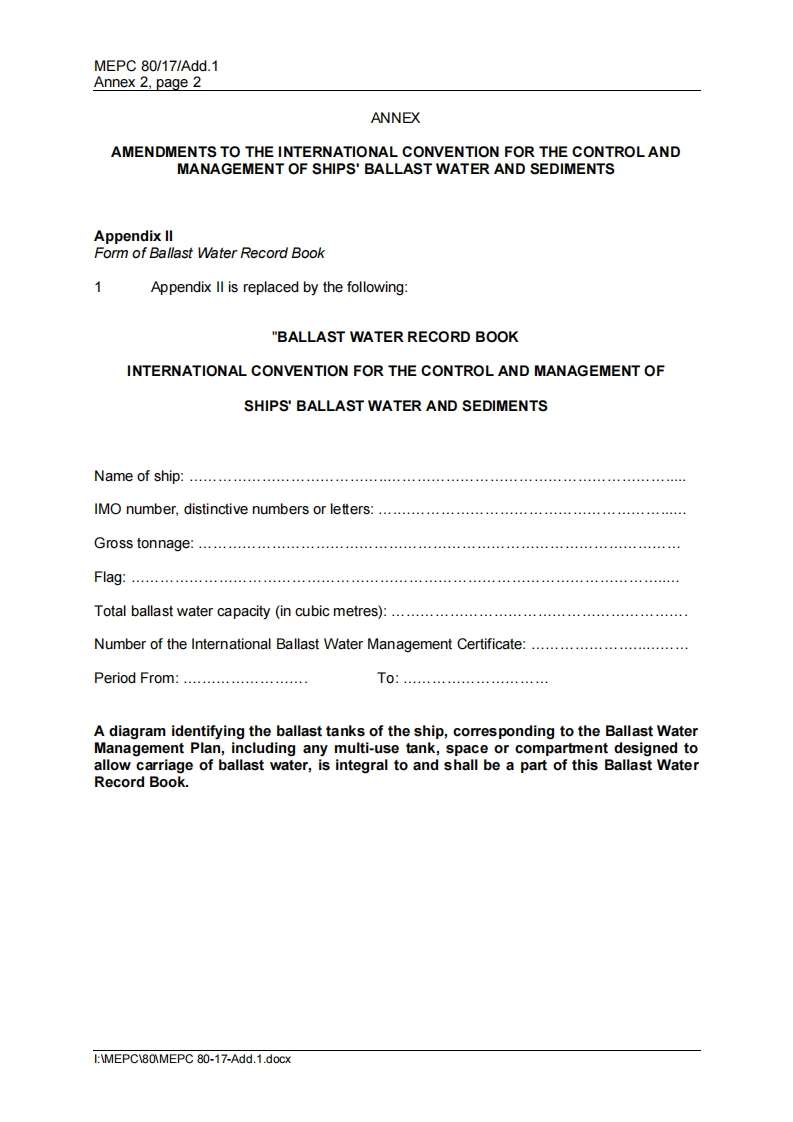MEPC 80/17/Add.1Annex 2,page 1ANNEX 2RESOLUTION MEPC.369(80)(adopted on 7 July 2023)AMENDMENTS TO THE INTERNATIONAL CONVENTION FOR THE CONTROL ANDMANAGEMENT OF SHIPS'BALLAST WATER AND SEDIMENTS,2004Amendments to appendix ll(Form of Ballast Water Record Book)THE MARINE ENVIRONMENT PROTECTION COMMITTEE,RECALLING Article 38(a)of the Convention on the International Maritime Organizationconcerning the functions of the Marine Environment Protection Committee conferred upon itby international conventions for the prevention and control of marine pollution from ships,RECALLING ALSO article 19 of the International Convention for the Control and Managementof Ships'Ballast Water and Sediments,2004 (the BWM Convention),which specifies theamendment procedure and confers upon the Marine Environment Protection Committee of theOrganization the function of considering amendments thereto for adoption by the Parties,HAVING CONSIDERED,at its eightieth session,proposed amendments to appendix ll of theBWM Convention regarding the form of Ballast Water Record Book,1ADOPTS,in accordance with article 19(2)(c)of the BWM Convention,amendmentsto appendix ll,the text of which is set out in the annex to the present resolution;2DETERMINES,in accordance with article 19(2)(e)(ii)of the BWM Convention,thatthe amendments shall be deemed to have been accepted on 1 August 2024 unless,prior tothat date,more than one third of the Parties have notified the Secretary-General that theyobject to the amendments;3INVITES the Parties to note that,in accordance with article 19(2)(f)(ii)of the BWMConvention,the said amendments shall enter into force on 1 February 2025 upon theiracceptance in accordance with paragraph 2 above;REQUESTS the Secretary-General,for the purposes of article 19(2)(d)of the BWMConvention,to transmit certified copies of the present resolution and the text of theamendments contained in the annex to all Parties to the BWM Convention;5ALSO REQUESTS the Secretary-General to transmit copies of the present resolutionand its annex to Members of the Organization which are not Parties to the BWM Convention;6FURTHER REQUESTS the Secretary-General to prepare a consolidated certified textof the BWM Convention.I:MEPC80MEPC 80-17-Add.1.docx