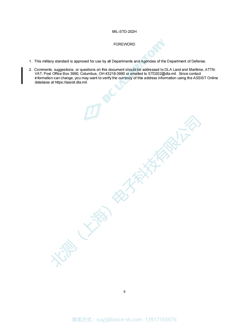 INCH-POUNDMIL-STD-202H18 April 2015C LBORATORYSUPERSEDINGMIL-STD-202Gw/CHANGE 228June2013DEPARTMENT OF DEFENSETEST METHOD STANDARDELECTRONIC AND ELECTRICAL COMPONENT PARTS技有郁OFEPARTMENTDEFENSE人AMERICN北测(上海STATESOFAMSC N/AFSC 59GP可姓回联系方式:xuyj@beice-sh.com13917165676