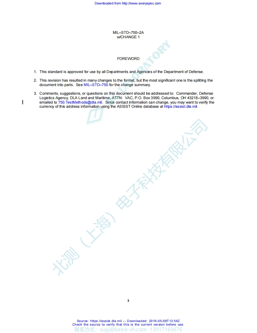 Downloaded from http://www.everyspec.comThe documentation and process conversionINCH-POUNDmeasures necessary to comply with this revisionMIL-STD-750-2Ashall be completed by 25 March 2016.WCHANGE 124 December 2015SUPERSEDINGBC LABORATORYMIL-STD-750-2A23 January 2015(see6.4)DEPARTMENT OF DEFENSETEST METHOD STANDARDMECHANICAL TEST METHODS FOR SEMICONDUCTOR DEVICESPART 2:TEST METHODS 2001 THROUGH 2999OFDEPARTMENTDEFENSATEDAMERICN北测(上STATESOFAMSC N/AFSC 5961▣瓶▣Source:https://assist.dla.mil --Downloaded:2016-05-08T13:56Z▣Check the source to verify that this is the current version before use联系方式:Xuyj@beice-sh.com13917165676