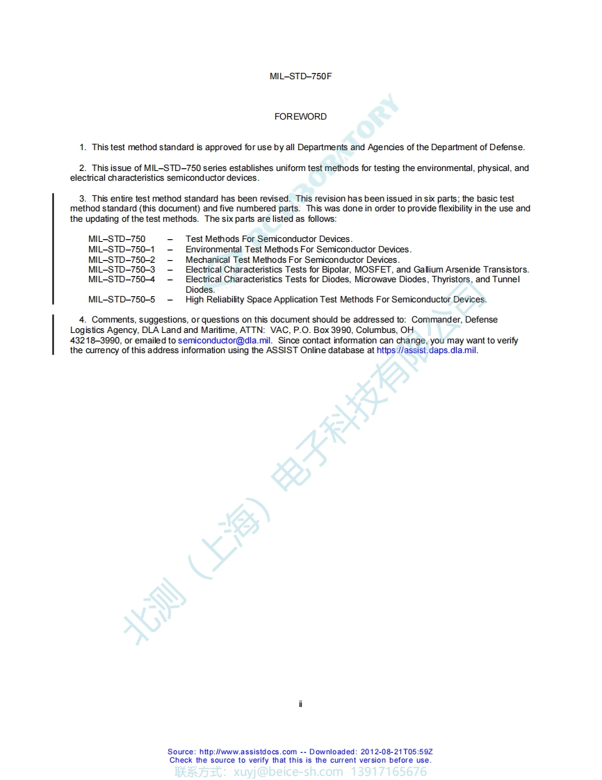 The documentation and processINCH-POUNDconversion measured necessaryMIL-STD-750Fto comply with this revision shal3 January 2012be completed by 3 July 2012.SUPERSEDINGMIL-STD-750ELABORATORY20 November 2006DEPARTMENT OF DEFENSETEST METHOD STANDARDTEST METHODS FOR SEMICONDUCTOR DEVICESOFDEPARTMENTDEFENSETEDAMERICAYOF北测(上STATESAMSC N/AFSC 5961Source:http://www.assistdocs.com --Downloaded:2012-08-21T05:59ZCheck the source to verify that this is the current version before use联系方式:xuyj@beice-sh.com13917165676