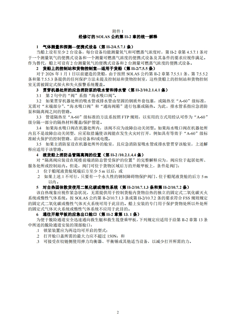 海安会MSC.1/Circ.l456/Rew.1通函(2024年7月3日)经修订的SOLAS公约第Ⅱ-2章以及FSS和FTP规则的统一解释1海上安全委员会在其第92届会议(2013年6月12日至21日)上,为了对$0LAS公约第Ⅱ-2章以及FSS和FTP规则的相关要求的应用提供更具体的指导,批准了防火分委会在其第56次会议(2013年1月7日至11日)上编制的《SOLAS公约第Ⅱ-2章以及FSS和FTP规则的统一解释》(MSC.1/Circ.1456通函).2海上安全委员会在其第94届会议(2014年11月17日至21日)上,为便于统一实施S0LAS公约第Ⅱ-210.2.1.4.4条,批准了船舶系统和设备分委会在其第1次会议(2014年3月10日至14日)上编制的关于液货船上消防总管隔离阀位置的《SOLAS公约第Ⅱ-2章以及FSS和FTP规则的统一解释(MSC/Circ.1456通函)的修正案》(MSC.1/Circ.1492通函)。3海上安全委员会在其108届会议(2024年5月15日至24日)上,批准了船舶系统和设备分委会在其第9次会议(2023年2月27日至3月3日)上编制的统一解释的修正案,作为MSC.550(108)决议通过的SOLAS公约第Ⅱ-27.5.5条修正案后续衍生的修正案,涉及起居和服务处所及控制站的保护。4提请各成员国政府在应用SOLAS公约第Ⅲ-2章以及FSS和FTP规则的相关规定时使用附件中的统一解释作为指导并使所有相关方注意到本统一解释。5本通函代替MSC.1/Circ.1456通函以及MSC.1Circ.1492通函.
