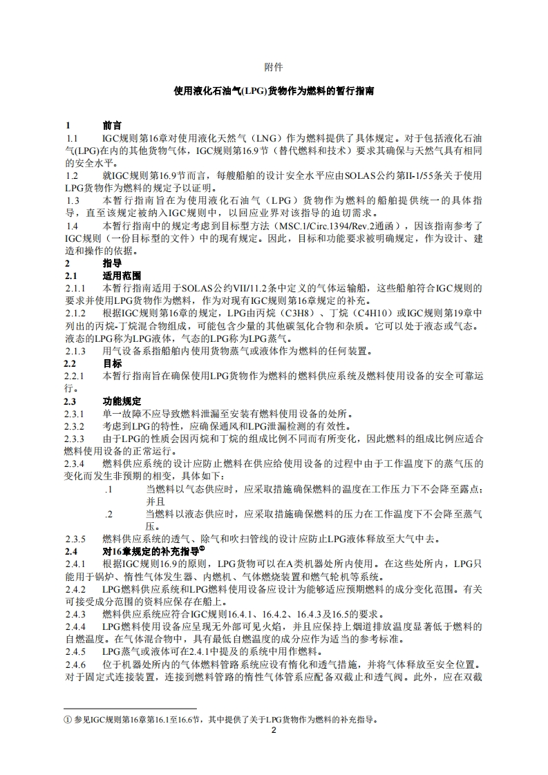 海安会MC.1/Circ.1679通函(2024年7月1日)使用液化石油气(LPG)货物作为燃料的暂行指南1海上安全委员会(MSC)在其第108届会议(2024年5月15日至24日)上审议了货物和集装箱运输分委会在其第9次会议(2023年9月20日至29日)上提出的提案,批准了《使用液化石油气LPG)货物作为燃料的暂行指南》,其文本载于附件,旨在对经修正的《国际散装运输液化气体船舶构造和设备规则》(IGC规则)中关于安全使用LPG货物作为燃料提供指导。2本委员会同意继续评审本暂行指南,并根据其应用过程中获得的经验和/或的情对其进行修正。3提请各成员国使所有相关方注意到所附的的暂行指南。