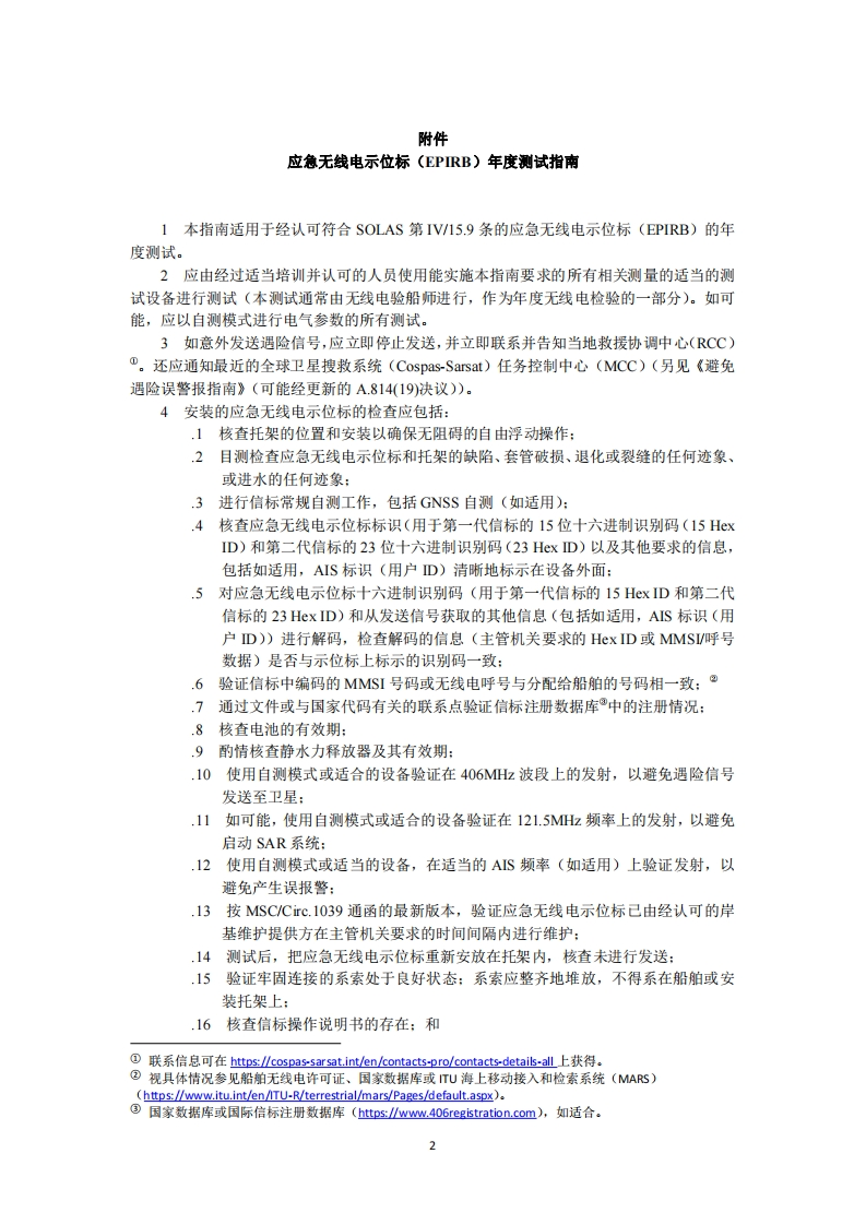 海安会MSC.l/Circ.l040/Rev.2通函(2021年10月18日)应急无线电示位标(EPRB)年度测试指南1海上安全委员会在其第104届会议(2021年10月4日至8日上,批准了航行、通信和搜救分委会(NCSR)在其第8次会议(2021年4月19日至23日)上制定的经修订的《应急无线电示位标(EPRB)年度测试指南》,其文本载于附件。2提请各成员国政府使航运公司、船东、船舶经营人、无线电验船师、设备制造商、船级社、船长和所有其他相关方注意本指南。3本通函取代MSC.1/Circ.1040/Rev.1通函。