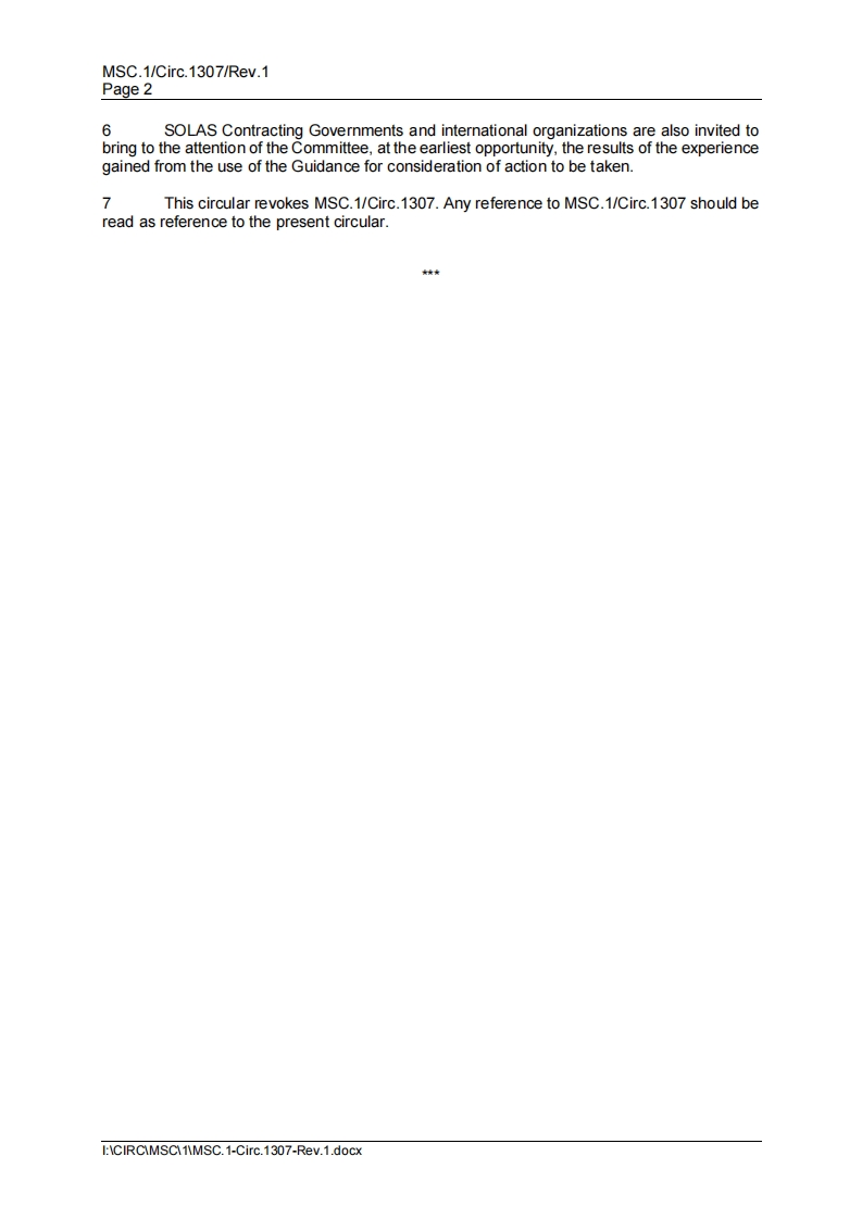 INTERNATIONALEMARITIMEORGANIZATION4 ALBERT EMBANKMENTLONDON SE1 7SRTelephone:+44(0)2077357611FaX:+44(0)2075873210MSC.1/Circ.1307/Rev.128 November 2022GUIDANCE ON THE SURVEY AND CERTIFICATION OF COMPLIANCE OF SHIPSWITH THE REQUIREMENT TO TRANSMIT LRIT INFORMATION1 The Maritime Safety Committee (the Committee),at its 106th session(2 to 11 November 2022),approved amendments to the Guidance on the survey andcertification of compliance of ships with the requirement to transmit LRIT information(MSC.1/Circ.1307)(the Guidance)prepared by the Sub-Committee on Navigation,Communications and Search and Rescue,at its ninth session (NCSR 9/24/Add.1,annex 5).This circular incorporates the aforesaid amendments as well as additional editorialamendments and minor comections.The Guidance outlines a number of alternative options for documenting complianceof the shipborne equipment with the requirements of SOLAS regulations V/19-1.6 and V/19-1.7and the related provisions of the revised Performance standards and functional requirementsfor the long-range identification and tracking of ships(revised Performance standards)adoptedby resolution MSC.263(84),as amended,and sets out the approach to be taken whensurveying and certifying the compliance of ships which are required to transmitLRIT information with the aforesaid obligation.The Guidance should be read together withSOLAS regulation V/19-1 and the revised Performance standards.3SOLAS Contracting Govemments are invited to bring the present circular and itsannex to the attention of recognized org anizations which they have authorized to act on theirbehalf and to provide to such recognized organizations any necessary further guidance andinstruction so as to ensure that the objectives of this circular are achieved.4SOLAS Contracting Governments are also invited to bring the present circular andthe salient parts of its annex to the attention of companies operating ships entitled to fly theirflag which are required to transmit LRIT infommation and to provide to such companies anynecessary further guidance and instruction so as to ensure that the objectives of this circularare achieved.5SOLAS Contracting Governments should communicate to the Organization as soonas possible the names and contact details of the Application Service Providers they have eitherrecognized within the framework of the revised Perfomance standards or they have authorizedto conduct conformance testing as set out in the attached Guidance,together with anyconditions attached to such recognitions or authorzations and update the information as andwhen changes occur.I:CIRCMSC1MSC.1-Circ.1307-Rev.1.docxGREENERSHIPPING