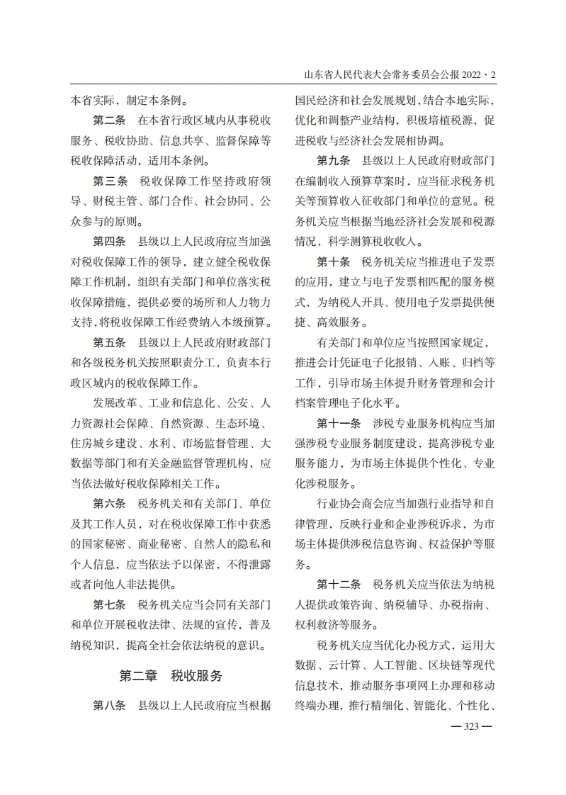 山东省税收保障条例【2022施行】348072@abc4个月前发布关注私信0.98MB5页045山东省税收保障条例【2022施行】此内容为付费资源,请付费后查看¥17¥32黄金会员免费钻石会员免费立即购买您当前未登录!建议登陆后购买,可保存购买订单付费资源 第1页 / 共5页 第2页 / 共5页 试读已结束,还剩3页,您可下载完整版后进行离线阅读 THE END法学类 文本预览 山东省税收保障条例2022年3月30日山东省第十三届人民代表大会常务委员会第三十四次会议通过第七章附则目录第一章总则第一章总则第二章税收服务第一条为了加强税收征收管理,保第三章税收协助护纳税人的合法权益,发挥税收在国家治第四章信息共享理中的基础性、支柱性、保障性作用,推第五章监督保障动高质量发展,根据《中华人民共和国税第六章法律责任收征收管理法》等法律、行政法规,结合-322 查看更多 收起部分 喜欢就支持一下吧收藏