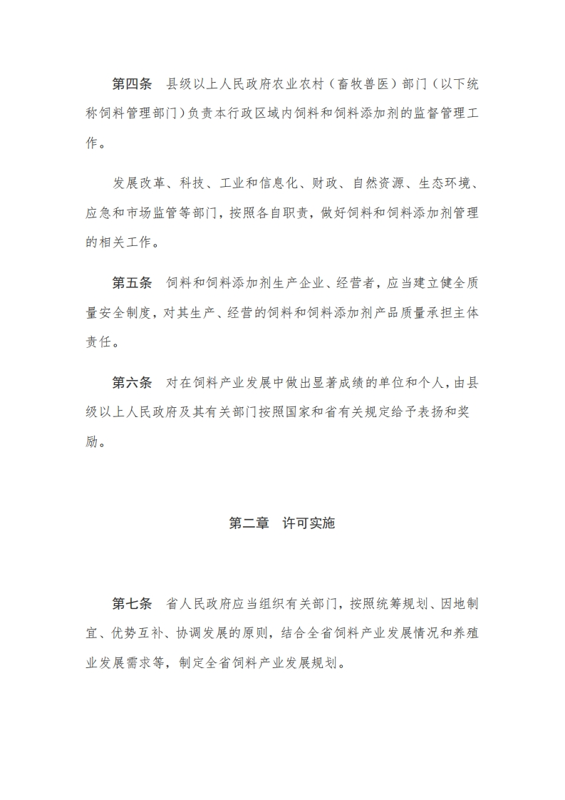 来源:山东省人民政府网站【字体:大中小】打印山东省饲料和饲料添加剂管理办法(2023年12月31日山东省人民政府令第356号公布自2024年3月1日起施行)第一章总则第一条为了加强对饲料和饲料添加剂的管理,提高产品质量,保护动物健康,保障动物产品和食品质量安全,根据国务院《饲料和饲料添加剂管理条例》,结合本省实际,制定本办法。第二条在本省行政区域内从事饲料和饲料添加剂的研制、生产、经营、使用及其监督管理活动,适用本办法。第三条县级以上人民政府应当加强饲料产业发展和饲料安全管理工作的领导,将饲料产业纳入当地国民经济和社会发展规划,统筹调整农业结构和增加农民收入,协调解决饲料产业发展中的重大问题,保障饲料用粮和动物产品安全,推动乡村振兴战略实施。