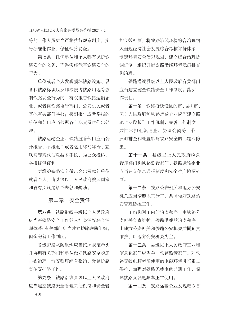 山东省人民代表大会常务委员会公报2021·2山东省铁路安全管理条例2021年3月24日山东省第十三届人民代表大会常务委员会第二十七次会议通过第四条铁路沿线县级以上人民政府目录应当按照国家有关规定将铁路建设纳入当第一章总则地国民经济和社会发展规划,建立健全护第二章安全责任路联防责任制,完善铁路沿线安全管理综第三章建设安全合协调机制,开展铁路安全宣传教育,协第四章线路安全调解决铁路安全管理工作中的重大问题。第五章运营安全铁路沿线乡镇人民政府、街道办事处第六章应急保障协助做好保障铁路安全的相关工作。第七章法律责任第五条铁路监管部门依法负责铁路第八章附则安全的监督管理工作。铁路沿线县级以上人民政府发展改第一章总则革、工业和信息化、公安、自然资源、生第一条为了加强铁路安全管理,保态环境、住房城乡建设、交通运输、水利、障铁路运输安全和畅通,保护人民群众生农业农村、应急管理、市场监督管理、城命和财产安全,根据《中华人民共和国铁市管理等部门,应当按照各自职责,做好路法》《铁路安全管理条例》等法律、行铁路安全管理的相关工作。政法规,结合本省实际,制定本条例。第六条铁路建设、运输和设备制造第二条本省行政区域内铁路的安全维修等企业应当落实安全生产主体责任,及其相关管理活动,适用本条例。加强安全管理,建立安全生产管理制度,第三条铁路安全管理应当坚持安全设置安全管理机构或者配备安全管理人第一、预防为主、综合治理的原则,实行员,加强对从业人员的安全教育培训,并政府统筹、企业负责、社会参与、行业监保证安全生产所必需的资金投人。管与属地保障相结合的工作机制。铁路建设、运输和设备制造维修企业一409—