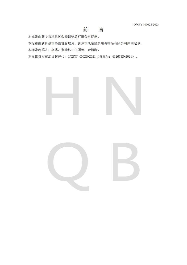 新乡市凤泉区余顺调味品有限公司企业强制性标准规范Q_XFYT0002S-2023液态复合调味料2023-10-05发布2023-10-05实施新乡市凤泉区余顺调味品有限公司发布348072@abc3天前发布关注私信0.23MB6页032新乡市凤泉区余顺调味品有限公司企业强制性标准规范Q_XFYT0002S-2023液态复合调味料2023-10-05发布2023-10-05实施新乡市凤泉区余顺调味品有限公司发布此内容为付费资源,请付费后查看¥19¥23黄金会员免费钻石会员免费立即购买您当前未登录!建议登陆后购买,可保存购买订单付费资源 第1页 / 共6页 第2页 / 共6页 试读已结束,还剩4页,您可下载完整版后进行离线阅读 THE END标准规范 喜欢就支持一下吧收藏