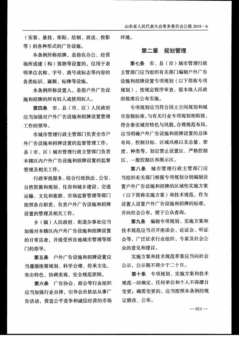 泰安市户外广告设施和招牌设置管理条例2019年10月31日泰安市第十七届人民代表大会常务委员会第二十一次会议通过2019年11月29日山东省第十三届人民代表大会常务委员会第十五次会议批准设置管理,营造规范有序、整洁优美的城目录乡环境,促进广告业健康有序发展,根据第一章总则《中华人民共和国广告法》《城市市容和第二章规划管理环境卫生管理条例》等法律、法规,结合第三章设置规范本市实际,制定本条例。第四章安全维护第二条本市行政区域内与设置户外第五章法律责任广告设施和招牌有关的规划管理、设置规第六章附则范、安全维护等管理及相关活动,适用本条例。第一章总则第三条本条例所称户外广告设施是第一条为加强户外广告设施和招牌指利用各类户外场所、空间和设施等设置一910