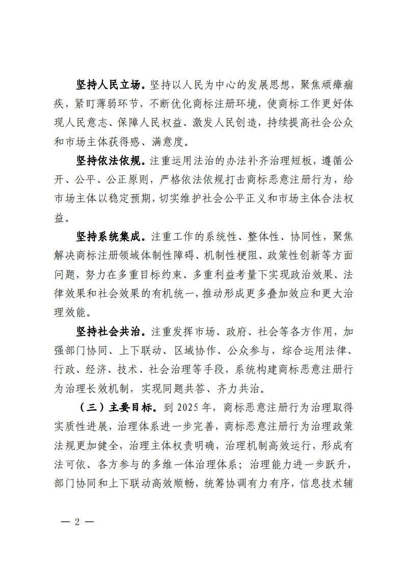 系统治理商标恶意注册促进高质量发展工作方案(2023一2025年)为深入贯彻《知识产权强国建设纲要(2021一2035年)》和《“十四五”国家知识产权保护和运用规划》确定的目标任务,进一步落实2023年全国知识产权局局长会议部署要求,巩固近年来打击商标恶意注册工作成果,全领域深化商标恶意注册行为治理,维护风清气正的商标注册管理秩序和公平竞争的市场秩序,营造良好创新环境和营商环境,制定本方案。一、总体要求(一)指导思想。以习近平新时代中国特色社会主义思想为指导,全面贯彻党的二十大精神,认真落实习近平总书记关于知识产权工作的重要指示论述,完整、准确、全面贯彻新发展理念,主动服务和融入新发展格局,加强系统治理、依法治理、综合治理、源头治理,更好统筹发展和安全、效率和公平、活力和秩序、国内和国际,以推动实现知识产权“两个转变”为主线,以构建适应高质量发展要求的商标注册秩序为目标,以商标恶意注册行为治理体系完善和效能提升为重点,加强知识产权法治保障,健全依法打击商标恶意注册行为工作机制,强化制度和信息化技术支撑,最大限度压缩商标恶意注册行为生存空间,有效防范化解商标领域重大风险,为知识产权强国建设和经济社会高质量发展提供有力保障。(二)基本原则。1