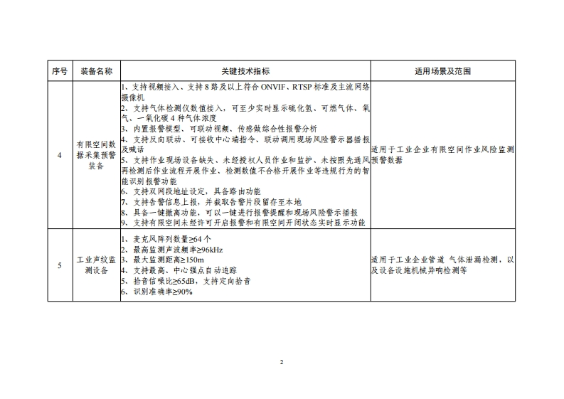 附件先进安全应急装备推广日录(工业领域2024版)序号装备名称关键技术指标适用场景及范围·、安全应急监测预警装备(28项)1、具备人脸识别、工作服识别、车辆等作业装备识别、安全帽检测等功能安全监测智适用于工业企业和工业园区现场作业的能布控球2、支持视频拼接和图片拼接,单镜头分辨率1920x1080、拼接分辨率过程记录及智能监测3000×10803、云台可360水平旋转、-30°-90°垂直旋转危险作业安1、可通过算法识别未戴安全帽、未正确佩戴防护眼镜、违规动火、违2全监测预警章吸烟、睡岗、违规阿入等危险作业场景适用于对工业领城危险作业人员安全风2、数据传输延时≤1s设备及系统险感知与智能监控预警危险作业行为识别准确率≥95%1、定位精度:室外≤0.5m,室内s3m3人员定位监2、续航时问:信标23年,定位工卡之30天适用于在工业企业、施工现场等对员工实测预警系统满足SRRC认证、EMC防干扰要求,CE-RED技术要求时精确定位