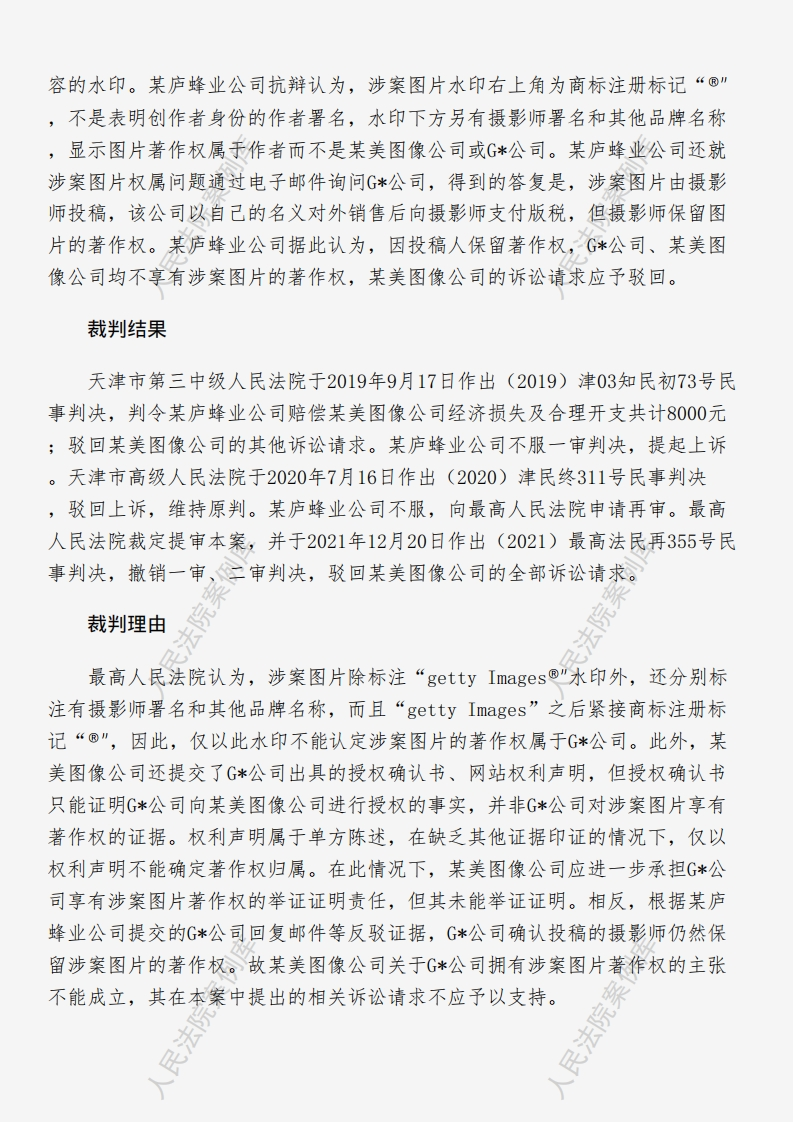 2023-18-2-158-002指导性案例224号:某美(天津)图像技术有限公司诉河南某庐蜂业有限公司侵害作品信息网络传播权纠纷案关键词:民事诉讼侵害作品信息网络传播权权属举证责任裁判要点在著作权权属有争议的情况下,不能仅凭水印或权利声明认定作品著作权权属,主张著作权的当事人应进一步举证证明,否则应当承担不利的法律后果0相关法条《中华人民共和国著作权法》(2020年修正)第12条(本案适用的是2010年修正的《中华人民共和国著作权法》第11条)《最高人民法院关于审理著作权民事纠纷案件适用法律若干问题的解释》(2020年修正)第7条《最高人民法院关于适用〈中华人民共和国民事诉讼法》的解释》(2022年修正)第90条(本案适用的是2020年修正的《最高人民法院关于适用(中华人民共和国民事诉讼法〉的解释》第90条)基本案情案外人G*公司授权某美(天津)图像技术有限公司(以下简称某美图像公司)在中国境内展示、销售和许可他人使用该公司的“getty Images”品牌图片,且某美图像公司有权以自己的名义对侵权行为提起诉讼。某美图像公司发现,河南某庐蜂业有限公司(以下简称某庐蜂业公司)未经许可使用了4张上述品牌图片。某美图像公司遂以侵害著作权为由提起诉讼,请求判令某庐蜂业公司赔偿经济损失及维权合理开支。为支持其诉请,某美图像公司提交了G*公司出具的授权确认书、网站权利声明等证据,涉案图片上有“getty Images®"内