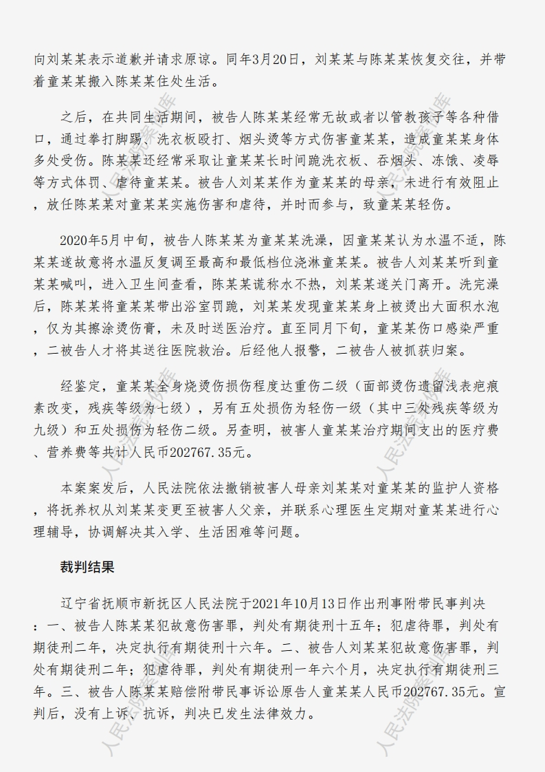 2024-18-1-179-007指导性案例226号:陈某某、刘某某故意伤害、虐待案关键词:刑事故意伤害罪虐待罪未成年人家庭成员以特别残忍手段致人重伤造成严重残疾裁判要点1.与父(母)的未婚同居者处于较为稳定的共同生活状态的未成年人,应当认定为刑法第二百六十条规定的“家庭成员”。2.在经常性的虐待过程中,行为人对被害人实施严重暴力,主观上希望或者放任、客观上造成被害人轻伤以上后果的,应当认定为故意伤害罪;如果将该伤害行为独立评价后,其他虐待行为仍符合虐待罪构成要件的,应当以故意伤害罪与虐待罪数罪并罚。3.对于故意伤害未成年人案件,认定是否符合刑法第二百三十四条第二款规定的以特别残忍手段致人重伤造成“严重残疾”,应当综合考量残疾等级、数量、所涉部位等情节,以及伤害后果对未成年人正在发育的身心所造成的严重影响等因素,依法准确作出判断。基本案情被告人刘某某系被害人童某某(系化名,女,2014年3月出生)的母亲。刘某某离婚后,童某某由刘某某直接抚养。2019年11月,刘某某结识被告人陈某某,后恋爱并同居。2020年2月13日,被告人陈某某因童某某与父亲视频聊天而心生不满,遂对童某某实施打耳光、踢踹等行为,为此,刘某某将童某某带离陈某某住处,并向陈某某提出分手。2月17日晚,陈某某来到刘某某住处,因分手之事迁怒于童某某,进门后直接将童某某瑞倒在地,又对童某某头部、身体、腿部猛瑞数脚。次日,刘某某带童某某就医治疗。童某某被诊断为:额部挫伤、颏部挫裂伤。此后,为躲避陈某某,刘某某带着童某某到朋友家暂住。其间,陈某某多次