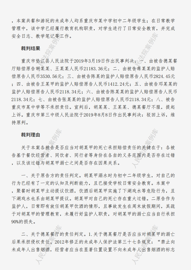 2024-18-2-001-002指导性案例227号:胡某某、王某某诉德某餐厅蒋某某等生命权纠纷案关键词:民事生命权未成年人多因一果侵权责任按份责任裁判要点1.经营者违反法律规定向未成年人售酒并供其饮用,因经营者的过错行为导致未成年人饮酒后遭受人身损害的风险增加,并造成损害后果的,应当认定违法售酒行为与未成年人饮酒后发生的人身损害存在因果关系,经营者依法应当承担相应的侵权责任。2.经营者违反法律规定向未成年人售酒并供其饮用、同饮者或者共同从事危险活动者未尽到相应提醒和照顾义务,对该未成年人造成同一损害后果的,应当按照过错程度《原因力大小等因素承担相应的按份赔偿责任。遭受人身损害的未成年人及其监护人对同一损害的发生存在过错的,按照民法典第一千一百七十三条的规定,可以减轻侵权人的责任。基本案情民胡某甲(殁年15周岁)系原告胡某某、王某某之子,其与蒋某某(时年14周岁)、陈某(时年14周岁)系重庆市某中学初中二年级学生。2018年5月19日,胡某甲等人来到重庆市某县德某餐厅为蒋某某庆祝生日,胡某甲提议要喝酒庆祝,蒋某某同意,遂在德某餐厅购买了啤酒,并在该餐厅就餐饮用。胡某甲及蒋某某每人喝了两瓶啤酒后,陈某到达该餐厅。随后,三人又在该餐厅喝了四瓶啤酒。饭后,胡某甲提议外出玩耍,后遇见陈某某、邓某某、张某某、王某甲等四人,七人相约至湖边玩耍。在湖边泡脚戏水过程中,胡某甲不慎后仰溺水。众人试图救援,但未能成功。胡某某、王某某将德某餐厅、其他六名未成年人及其监护人重庆市某中学等诉至法院,请求共同赔偿胡某甲的死亡赔偿金、丧葬费等损失。另查明