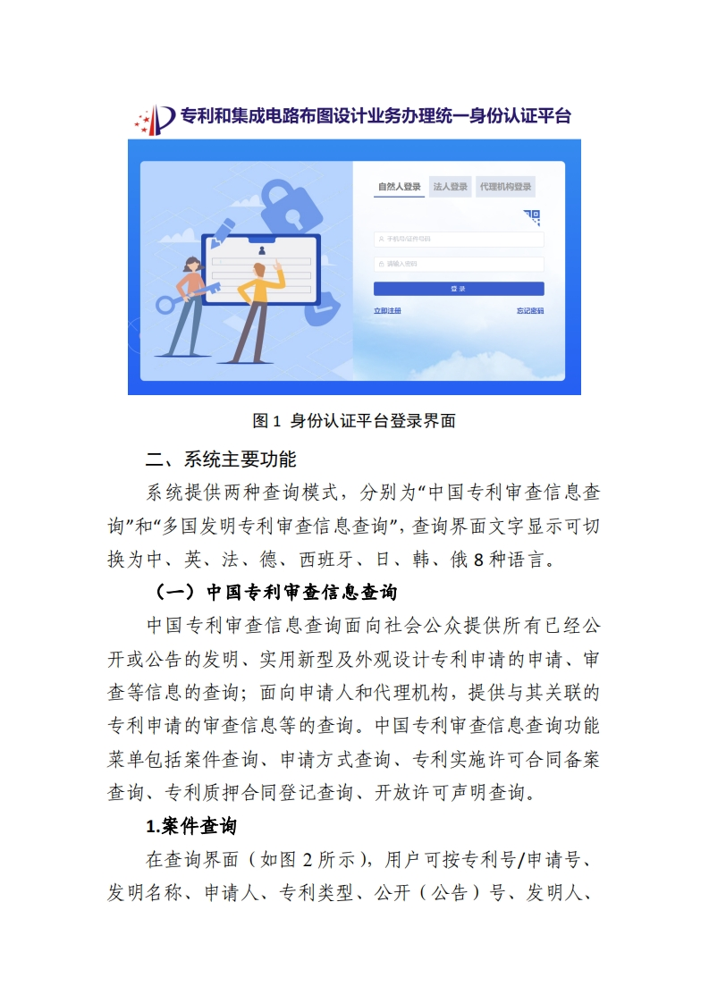 中国及多国专利审查信息查询系统简介为提供高效便捷的专利查询服务,中国及多国专利审查信息查询系统面向社会公众、申请人和代理机构等群体,提供中国已经公开或公告的发明、实用新型及外观设计专利申请的申请、审查等信息的查询,同时提供美、日、欧、韩四局的专利信息查询。一、系统访问与登录中国及多国专利审查信息查询系统有多种访问途径,常用的一是通过专利业务办理系统选择“专利审查信息查询”进行访问,二是通过国家知识产权官方网站政务服务栏目选择“专利审查信息查询”进行访问。访问时用户需通过专利和集成电路布图设计业务办理统一身份认证平台登录,平台提供3种登录模式(如图1所示),自然人使用手机号或证件号码登录,法人使用统一社会信用代码登录,代理机构使用代理机构代码登录。如需注册账号,根据提示进入注册界面,按要求填写信息即可完成注册。