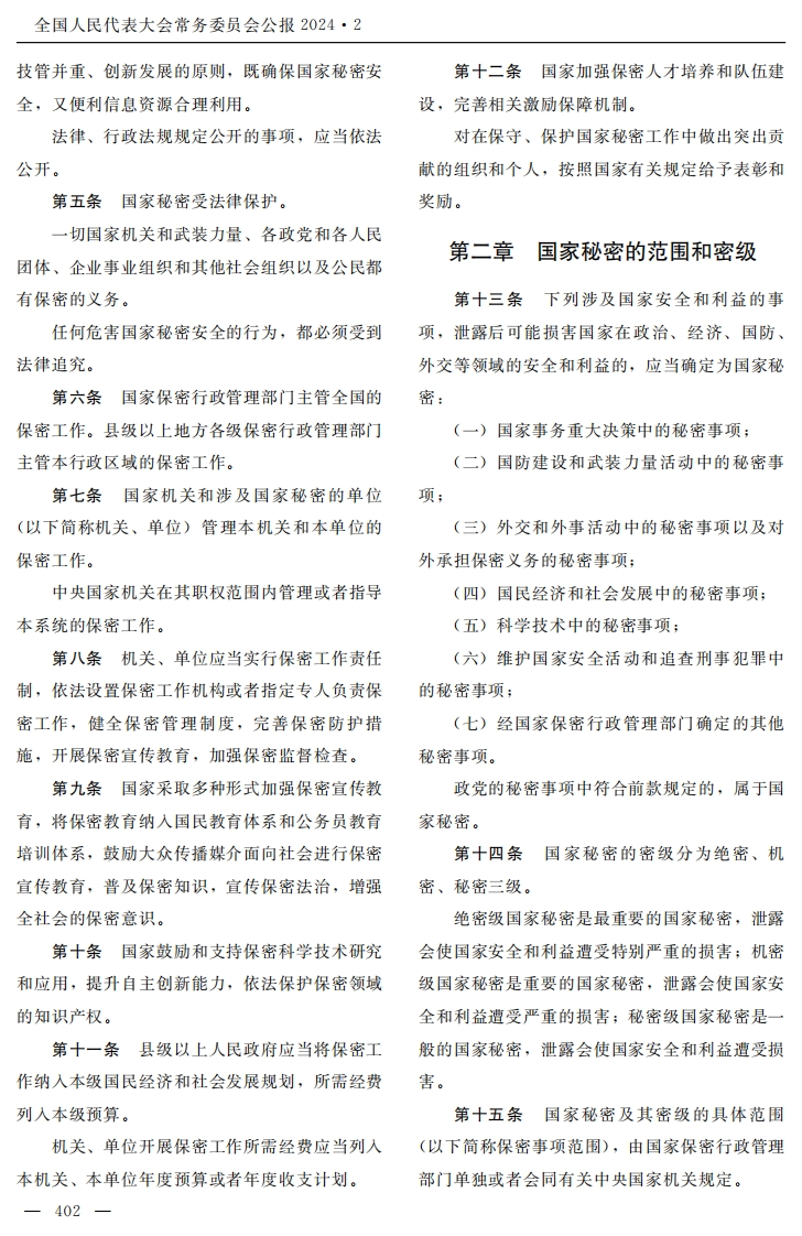 全国人民代表大会常务委员会公报2024·2中华人民共和国主席令第二十号《中华人民共和国保守国家秘密法》已由中华人民共和国第十四届全国人民代表大会常务委员会第八次会议于2024年2月27日修订通过,现予公布,自2024年5月1日起施行。中华人民共和国主席习近平2024年2月27日中华人民共和国保守国家秘密法(1988年9月5日第七届全国人民代表大会常务委员会第三次会议通过2010年4月29日第十一届全国人民代表大会常务委员会第十四次会议第一次修订2024年2月27日第十四届全国人民代表大会常务委员会第八次会议第二次修订)业的顺利进行,根据宪法,制定本法。目录第二条国家秘密是关系国家安全和利益,第一章总则依照法定程序确定,在一定时间内只限一定范围第二章国家秘密的范围和密级的人员知悉的事项。第三章保密制度第三条坚持中国共产党对保守国家秘密第四章监督管理(以下简称保密)工作的领导。中央保密工作领第五章法律责任导机构领导全国保密工作,研究制定、指导实施第六章附则国家保密工作战略和重大方针政策,统筹协调国家保密重大事项和重要工作,推进国家保密法治第一章总则建设。第一条为了保守国家秘密,维护国家安全第四条保密工作坚持总体国家安全观,遵和利益,保障改革开放和社会主义现代化建设事循党管保密、依法管理,积极防范、突出重点,-401-