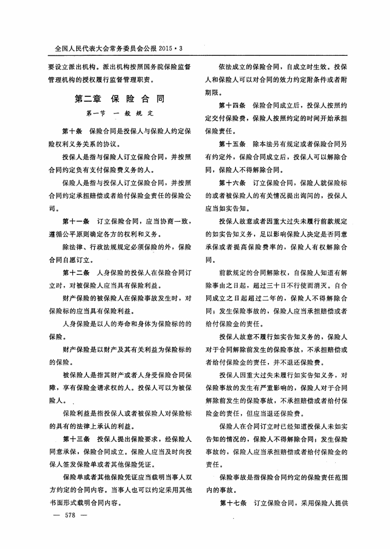 全国人民代表大会常务委员会公报2015·3中华人民共和国保险法(1995年6月30日第八届全国人民代表大会常务委员会第十四次会议通过根据2002年10月28日第九届全国人民代表大会常务委员会第三十次会议《关于修改《中华人民共和国保险法》的决定》第一次修正2009年2月28日第十一届全国人民代表大会常务委员会第七次会议修订根据2014年8月31日第十二届全国人民代表大会常务委员会第十次会议《关于修改(中华人民共和国保险法》等五部法律的决定》第二次修正根据2015年4月24日第十二届全国人民代表大会常务委员会第十四次会议《关于修改《中华人民共和国计量法》等五部法律的决定》第三次修正)失承担赔偿保险金责任,或者当被保险人死亡、目录伤残、疾病或者达到合同约定的年龄、期限等条第一章总则件时承担给付保险金责任的商业保险行为。第二章保险合同第三条在中华人民共和国境内从事保险活第一节一般规定动,适用本法。第二节人身保险合同第四条从事保险活动必须遵守法律、行政第三节财产保险合同法规,尊重社会公德,不得损害社会公共利益。第三章保险公司第五条·保险活动当事人行使权利、履行义第四章保险经营规则务应当遵循诚实信用原则。第五章保险代理人和保险经纪人第六条保险业务由依照本法设立的保险公第六章保险业监督管理司以及法律、行政法规规定的其他保险组织经第七章法律责任营,其他单位和个人不得经营保险业务。第八章附则第七条在中华人民共和国境内的法人和其他组织需要办理境内保险的,应当向中华人民共第一章总则和国境内的保险公司投保。第一条为了规范保险活动,保护保险活动第八条保险业和银行业、证券业、信托业当事人的合法权益,加强对保险业的监督管理,实行分业经营、分业管理,保险公司与银行、证维护社会经济秩序和社会公共利益,促进保险事·券、信托业务机构分别设立。国家另有规定的除亚的健康发展,制定本法。外。第二条本法所称保险,是指投保人根据合第九条国务院保险监督管理机构依法对保同约定,向保险人支付保险费,保险人对于合同险业实施监督管理。约定的可能发生的事故因其发生所造成的财产损国务院保险监督管理机构根据履行职责的需一577—
