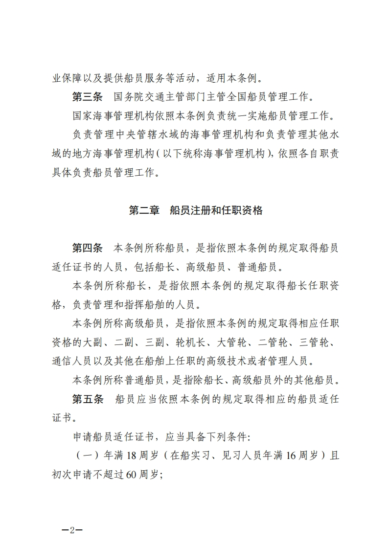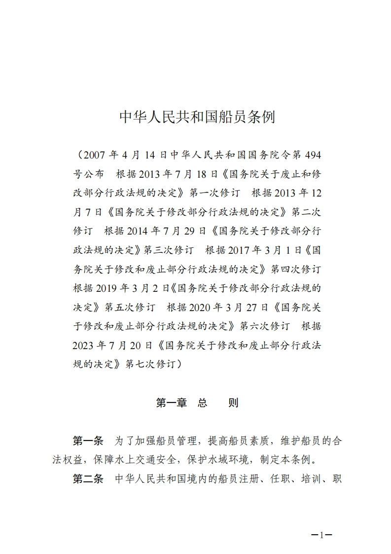 中华人民共和国船员条例(2007年4月14日中华人民共和国国务院令第494号公布根据2013年7月18日《国务院关于废止和修改部分行政法规的决定》第一次修订根据2013年12月7日《国务院关于修改部分行政法规的决定》第二次修订根据2014年7月29日《国务院关于修改部分行政法规的决定》第三次修订根据2017年3月1日《国务院关于修改和废止部分行政法规的决定》第四次修订根据2019年3月2日《国务院关于修改部分行政法规的决定》第五次修订根据2020年3月27日《国务院关于修改和废止部分行政法规的决定》第六次修订根据2023年7月20日《国务院关于修改和废止部分行政法规的决定》第七次修订)第一章总则第一条为了加强船员管理,提高船员素质,维护船员的合法权益,保障水上交通安全,保护水域环境,制定本条例。第二条中华人民共和国境内的船员注册、任职、培训、职-1-