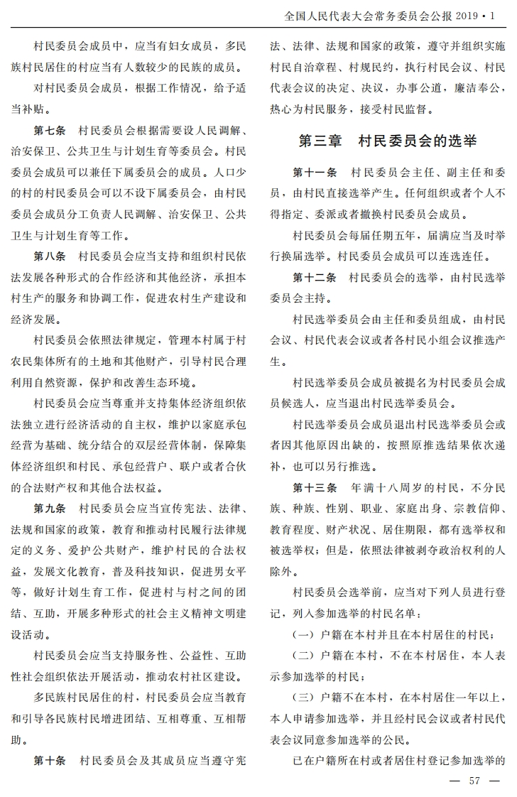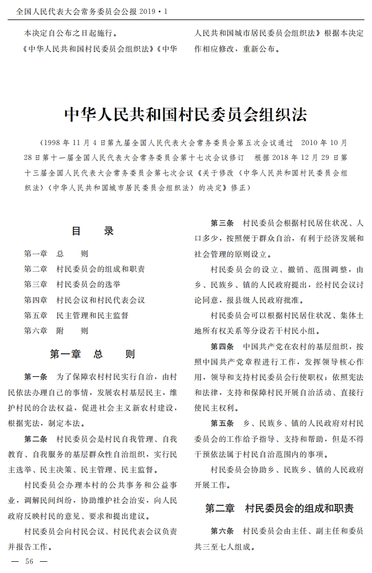 全国人民代表大会常务委员会公报2019·1本决定自公布之日起施行。人民共和国城市居民委员会组织法》根据本决定《中华人民共和国村民委员会组织法》《中华作相应修改,重新公布。中华人民共和国村民委员会组织法(1998年11月4日第九届全国人民代表大会常务委员会第五次会议通过2010年10月28日第十一届全国人民代表大会常务委员会第十七次会议修订根据2018年12月29日第十三届全国人民代表大会常务委员会第七次会议《关于修改《中华人民共和国村民委员会组织法》〈中华人民共和国城市居民委员会组织法〉的决定》修正)第三条村民委员会根据村民居住状况、人目录口多少,按照便于群众自治,有利于经济发展和第一章总则社会管理的原则设立。第二章村民委员会的组成和职责村民委员会的设立、撤销、范围调整,由第三章村民委员会的选举乡、民族乡、镇的人民政府提出,经村民会议讨第四章村民会议和村民代表会议论同意,报县级人民政府批准。第五章民主管理和民主监督村民委员会可以根据村民居住状况、集体土第六章附则地所有权关系等分设若干村民小组。第四条中国共产党在农村的基层组织,按第一章总则照中国共产党章程进行工作,发挥领导核心作第一条为了保障农村村民实行自治,由村用,领导和支持村民委员会行使职权;依照宪法民依法办理自己的事情,发展农村基层民主,维和法律,支持和保障村民开展自治活动、直接行护村民的合法权益,促进社会主义新农村建设,使民主权利。根据宪法,制定本法。第五条乡、民族乡、镇的人民政府对村民第二条村民委员会是村民自我管理、自我委员会的工作给予指导、支持和帮助,但是不得教育、自我服务的基层群众性自治组织,实行民干预依法属于村民自治范围内的事项。主选举、民主决策、民主管理、民主监督。村民委员会协助乡、民族乡、镇的人民政府村民委员会办理本村的公共事务和公益事开展工作。业,调解民间纠纷,协助维护社会治安,向人民第二章村民委员会的组成和职责政府反映村民的意见、要求和提出建议。村民委员会向村民会议、村民代表会议负责第六条村民委员会由主任、副主任和委员并报告工作。共三至七人组成。-56—