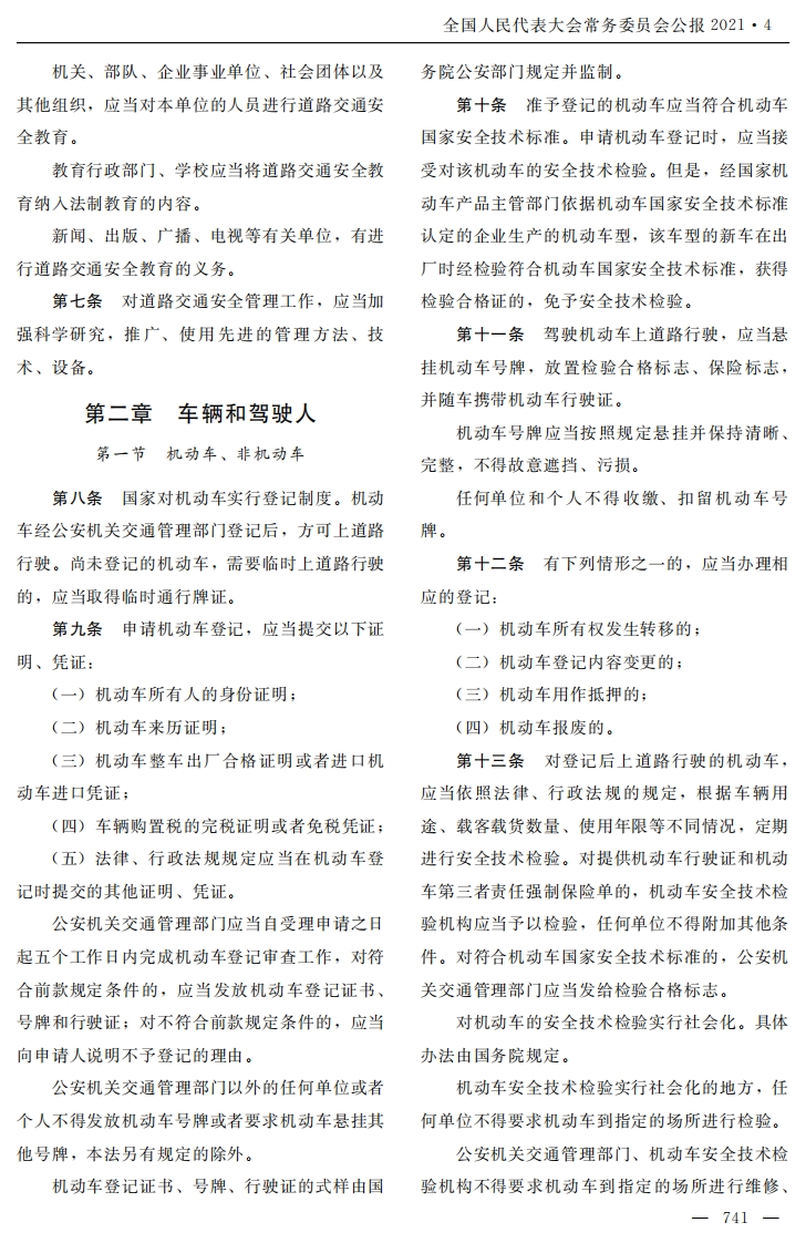 全国人民代表大会常务委员会公报2021·4中华人民共和国道路交通安全法(2003年10月28日第十届全国人民代表大会常务委员会第五次会议通过根据2007年12月29日第十届全国人民代表大会常务委员会第三十一次会议《关于修改《中华人民共和国道路交通安全法〉的决定》第一次修正根据2011年4月22日第十一届全国人民代表大会常务委员会第二十次会议《关于修改〈中华人民共和国道路交通安全法〉的决定》第二次修正根据2021年4月29日第十三届全国人民代表大会常务委员会第二十八次会议《关于修改〈中华人民共和国道路交通安全法〉等八部法律的决定》第三次修正)第二条中华人民共和国境内的车辆驾驶目录人、行人、乘车人以及与道路交通活动有关的单第一章总则位和个人,都应当遵守本法。第二章车辆和驾驶人第三条道路交通安全工作,应当遵循依法第一节机动车、非机动车管理、方便群众的原则,保障道路交通有序、安第二节机动车驾驶人全、畅通。第三章道路通行条件第四条各级人民政府应当保障道路交通安第四章道路通行规定全管理工作与经济建设和社会发展相适应。第一节一般规定县级以上地方各级人民政府应当适应道路交第二节机动车通行规定通发展的需要,依据道路交通安全法律、法规和第三节非机动车通行规定国家有关政策,制定道路交通安全管理规划,并第四节行人和乘车人通行规定组织实施。第五节高速公路的特别规定第五条国务院公安部门负责全国道路交通第五章交通事故处理安全管理工作。县级以上地方各级人民政府公安第六章执法监督机关交通管理部门负责本行政区域内的道路交通第七章法律责任安全管理工作。第八章附则县级以上各级人民政府交通、建设管理部门依据各自职责,负责有关的道路交通工作。第一章总则第六条各级人民政府应当经常进行道路交第一条为了维护道路交通秩序,预防和减通安全教育,提高公民的道路交通安全意识。少交通事故,保护人身安全,保护公民、法人和公安机关交通管理部门及其交通警察执行职其他组织的财产安全及其他合法权益,提高通行务时,应当加强道路交通安全法律、法规的宣效率,制定本法。传,并模范遵守道路交通安全法律、法规。-740-
