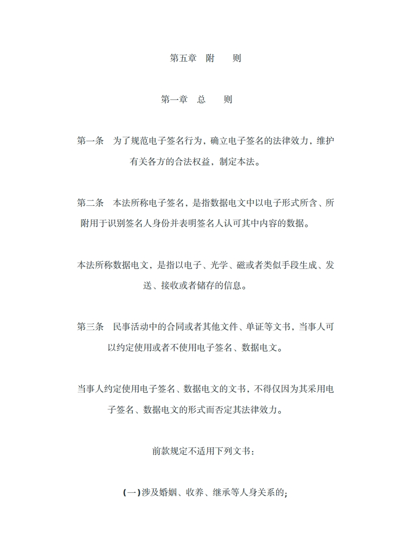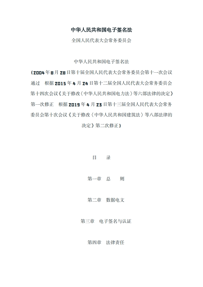 中华人民共和国电子签名法全国人民代表大会常务委员会中华人民共和国电子签名法(Z004年日月Z日日第十届全国人民代表大会常务委员会第十一次会议通过根据Z015年4月Z4日第十二届全国人民代表大会常务委员会第十四次会议《关于修改〈中华人民共和国电力法〉等六部法律的决定》第一次修正根据2019年4月Z3日第十三届全国人民代表大会常务委员会第十次会议《关于修改〈中华人民共和国建筑法〉等八部法律的决定》第二次修正)目录第一章总则第二章数据电文第三章电子签名与认证第四章法律责任