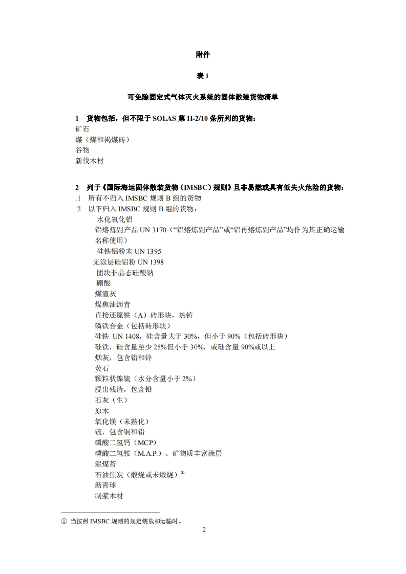 海安会MSC.1/Circ1395/Rev.5通函(2022年4月28日)可免除固定式气体灭火系统或固定式气体灭火系统对之无效的固体散装货物清单1海上安全委员会在其第64届会议(1994年12月5日至9日)上,同意有必要就SOLAS公约第Ⅱ-210条中关于免除灭火系统要求的规定向主管机关提供指南。2因此,本委员会批准了MSC/Circ.671通函,以此同意:.1一份可免除固定式气体灭火系统的固体散装货物清单(表1),并建议各成员国在按SOLAS公约第-2/10.7.1.4条准予免除时考虑到表1中的信息;和.2一份固定式气体灭火系统对之无效的固体散装货物清单(表2),并建议在载运表2中所列货物的船舶的货物处所内设有提供等效保护的灭火系统。本委员会还同意主管机关在确定关于等效灭火系统的合适要求时,应考虑SOLAS公约第-2/19.3.1条的规定.3海上安全委员会在其第79届会议(2004年12月1日至10日)上,审查了上述列表并批准了MSC/Cic.1146通函。本委员会决定将定期对所附列表进行审查,且提请各成员国在对船舶载运不包括在表1内的货物准予免除时,向国际海事组织提供关于这些货物不燃性或着火危险性的数据。还请求各成员国在对其同意载运不包括在表2内的货物而要求等效灭火系统时,向国际海事组织提供关于固定式气体灭火系统对这些货物无效的数据。4海上安全委员会在其第89届会议(2011年5月11日至20日)上,注意到MSBC规则的强制性,对上述固体散装货物列表进行了审查,使表中某些名称与M①G规则最新版本中的名称一致并批准了MSC.1/CiC.1395通函《可免除固定式气体灭火系统或固定式气体灭火系统对之无效的固体散装货物清单》,用以取代MSC/Ci心.1146通函。海上安全委员会在其第92届会议(2013年6月12至21日)上批准了对MSC.1Ci心.1395通函的修订(MSC.1/Circ.1395/Rev.1通函)。5海上安全委员会在其第95届会议(2015年6月3日至12日)上,经审议货物及集装箱运输分委会在其第1次会议上所提交的提案,批准了对MSC.1/Circ.1395Rev.1通函表1和表2的修订(MSC.1/Circ.1395/Rev.2通函)。6海上安全委员会在其第98届会议(2017年6月7日至16日)上,经审议货物及集装箱运输分委会在其第3次会议上所提交的提案,批准了对MSC.1/Circ.1395/Rev.2通函表1和表2的修订(MSC.1/Circ.1395/Rev.3通函).7海上安全委员会在其第101届会议(2019年6月5日至14日)上,经审议货物及集装箱运输分委会在其第3次会议上所提交的提案,批准了对MSC.1/Circ.1395/Rv.3通函表1和表2的修订(MSC.1/Circ.1395/Rev.4通函)。8海上安全委员会在其第105届会议(2022年4月20日至29日)上,经审议货物及集装箱运输分委会在其第7次会议上所提交的提案,批准了对MSC.1/Circ.1395/Rev.4通函表1和表2的修订,其文本载于附件。9本通函的目的在于向主管机关提供指导。但是,不妨碍主管机关对不包括在表1内的货物准予免除,或按SOLAS公约第Ⅱ-210.7.1.4条规定准予此种免除时附加任何条件。10本通函替代MSC.1/Cic.1395/Rev.4通函.