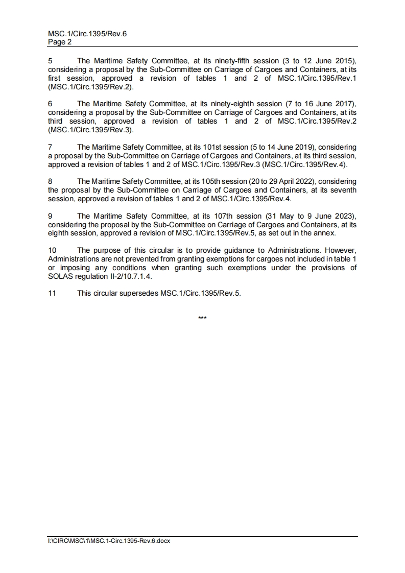 INTERNATIONALEMARITIMEORGANIZATION4 ALBERT EMBANKMENTLONDON SE1 7SRTelephone:+44(0)2077357611Fax:+44(0)2075873210MSC.1/Circ.1395/Rev.626June2023LISTS OF SOLID BULK CARGOES FOR WHICH A FIXED GAS FIRE-EXTINGUISHINGSYSTEM MAY BE EXEMPTED OR FOR WHICH A FIXED GAS FIRE-EXTINGUISHINGSYSTEM IS INEFFECTIVE1The Maritime Safety Committee,at its sixty-fourth session(5 to 9 December 1994),agreed that there was a need to provide Administrations with guidelines regarding theprovisions of SOLAS regulation ll-2/10 concerning exemptions from the requirements forfire-extinguishing systems.2Consequently,the Committee approved MSC/Circ.671 whereby it agreed to:a list of solid bulk cargoes,for which a fixed gas fire-extinguishing systemmay be exempted (table 1)and recommended Member States to take intoaccount the information contained in table 1 when granting exemptions underthe provisions of SOLAS regulation Il-2/10.7.1.4;and2a list of solid bulk cargoes for which a fixed gas fire-extinguishing system isineffective (table 2),and recommended that cargo spaces in a ship engagedin the camiage of cargoes listed in table 2 be provided with afire-extinguishing system which provides equivalent protection.The Committee also agreed that Administrations should take account of theprovisions of SOLAS regulation ll-2/19.3.1 when detemining suitablerequirements for an equivalent fire-extinguishing system.3The Maritime Safety Committee,at its seventy-ninth session(1 to 10 December 2004),reviewed the above-mentioned tables and approved MSC/Circ.1146.The Committee decidedthat the annexed tables should be periodically reviewed and invited Member States to providethe Organization,when granting exemptions to ships for the camiage of cargoes not includedin table 1,with data on the non-combustibility or fire risk properties of such cargoes.Member States were also requested to provide the Organization,when equivalentfire-extinguishing systems are required for the agreed camriage of cargoes not included intable 2,with data on the inefficiency of fixed gas fire-extinguishing systems for such cargoes.The Maritime Safety Committee,at its eighty-ninth session (11 to 20 May 2011),noting the mandatory status of the IMSBC Code,reviewed the aforementioned lists of solidbulk cargoes to align certain names in the lists with those in the recent version of theIMDG Code and approved MSC.1/Circ.1395 on Lists of solid bulk cargoes for which a fixedgas fire-extinguishing system may be exempted or for which a fixed gas fire-extinguishingsystem is ineffective,superseding MSC/Circ.1146.The Maritime Safety Committee,at itsninety-second session (12 to 21 June 2013),approved a revision of MSC.1/Circ.1395(MSC.1/Circ.1395/Rev.1).I:CIRCMSC1MSC.1-Circ.1395-Rev.6.docxMARPOL AT 50OUR CUMWTMENT GUESUN