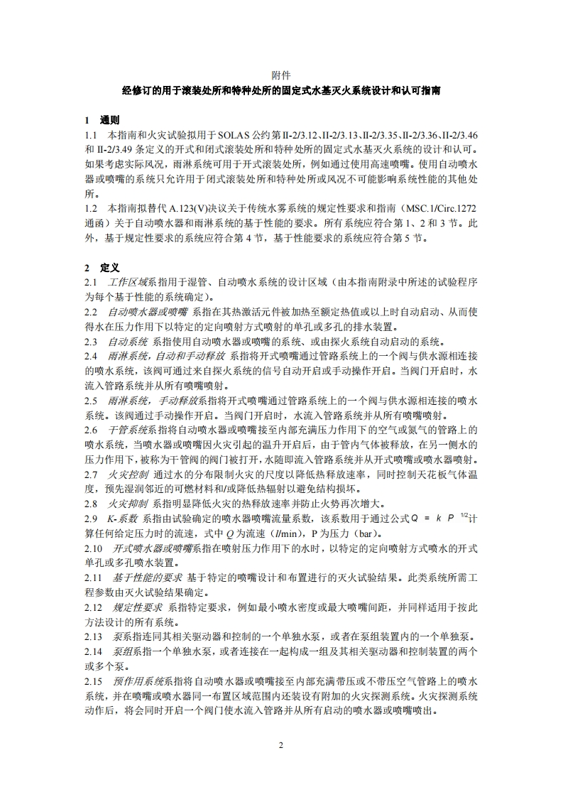 海安会MSC.1/Cire.1430/Rev.3通函(2023年6月27日)经修订的用于滚装处所和特种处所的固定式水基灭火系统设计和认可指南1海上安全委员会在其第84届会议(2008年5月7日至16日)上,批准了等效于A.123(V)决议要求的用于滚装处所和特种处所的固定式水基灭火系统认可指南(MSC.1/℃i心.1272通函)。2海上安全委员会在其第90届会议(2012年5月16日至25日)上,审议了防火分委会在其第55次会议上的提案,为了更新和整合《用于特种处所的固定式灭火系统建议案》(A.123(V)决议)的规定性要求和《等效于A.123(V)决议要求的用于滚装处所和特种处所的固定式水基灭火系统认可指南》(MSC.1/Circ.1272通函)的基于性能的要求,批准了《经修订的用于滚装处所和特种处所的固定式水基灭火系统设计和认可指南》(MSC.1℃i心.1430通函)。3本委员会注意到MSC.1/Circ.1430通函替代MSC.1/Circ.1272通函,但是之前按MSC/CirC.1272通函进行的耐火和部件试验,对于新系统的认可保持有效。4海上安全委员会在其第100届会议(2018年12月3日至7日)上,批准了船舶系统和设备分委会在其第5次会议上制定的上述经修订的指南(MSC.1/CirC.1430通函)的修正案草案,作为MSC.1/Circ.1430/Rev.1通函分发修正的经修订的指南。5海上安全委员会在其第102届会议(2020年11月4日至11日)上,批准了船舶系统和设备分委会在其第7次会议上制定的上述经修订的指南(MSC.1/Circ.1430Rev.1通函)表4-2和4-3标题的修正案草案,作为MSC.1℃i心.1430/Rv.2通函分发修正的经修订的指南.6海上安全委员会在其第107届会议(2023年5月31日至6月9日)上,批准了船舶系统和设备分委会在其第9次会议上制定的上述经修订的指南(MSC.1/Circ.1430Rev.2通函)关于术语“净空高度”的修正案草案,作为MSC.1/Cic.1430/Rev3通函分发,其文本载于附件。7提请各成员国政府在认可2024年1月1日或以后安装的用于滚装处所和特种处所的固定式水基灭火系统时应用附件中的经修订的指南,并使船舶设计者、船东、设备制造商、实验室和其他相关方注意到本指南。8本通函替代MSC.1/Circ.1430/Rev.2通函,但是之前按MSC.1/Circ.1272或MSC.1/Circ.1430或MSC.1/Circ.1430/Rev.1或MSC.1/Circ.1430/Rev.2通函进行的耐火和部件试验,对于新系统的认可保持有效。对于2024年1月1日以前安装的,根据A.123(V)决议、MSC.1/Circ.1272、MSC.1/Circ.1430、MSC.1/Circ.1430/Rev.1和MSC.1/Circ.1430/Rev.2通函认可和安装的用于特种处所的现有固定式灭火系统,只要能使用,应允许其继续使用。