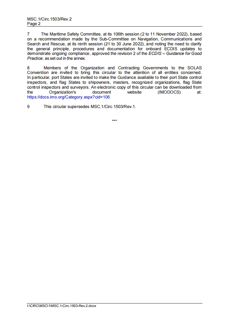 INTERNATIONALEMARITIMEORGANIZATION4 ALBERT EMBANKMENTLONDON SE1 7SRTelephone:+44(0)2077357611Fax:+44(0)2075873210MSC.1/Circ.1503/Rev.228 November 2022ECDIS-GUIDANCE FOR GOOD PRACTICE1The Maritime Safety Committee,at its ninety-fifth session (3 to 12 June 2015),approved the ECDIS-Guidance for Good Practice,drawing together relevant guidance fromseven previous ECDIS circulars into a single,consolidated document.ECDIS is a complex,safety-relevant,software-based system with multiple options fordisplay and integration.The ongoing safe and effective use of ECDIS involves manystakeholders including seafarers,equipment manufacturers,chart producers,hardware andsoftware maintenance providers,shipowners and operators,and training providers.It isimportant that all these stakeholders have a clear and common understanding of their rolesand responsibilities in relation to ECDIS.3In 2002,ECDIS was accepted as meeting the chart carriage requirements of SOLASregulation V/19.Over the years,IMO Member States,hydrographic offices,equipmentmanufacturers and other org anizations contributed to the development of guidance on a varietyof ECDIS-related matters and IMO issued a series of complementary circulars on ECDIS.While most useful IMO guidance on ECDIS was developed in this incrementalmanner,the information needed to be consolidated,where possible,to have ECDIS-relatedguidance within a single circular,which could be easily kept up to date without duplication orneed for continual cross-referencing.Such consolidation of information offers clear andunambiguous understanding of the carriage requirements and use of ECDIS.5The consolidated guidance termed "ECD/S-Guidance for Good Practice"is set outin the annex to this circular.Ship operators,masters and deck officers on ECDIS-fitted shipsare encouraged to use this Guidance to improve their understanding and facilitate safe andeffective use of ECDIS.6The Maritime Safety Committee,at its ninety-eighth session (7 to 16 June 2017),based on a recommendation made by the Sub-Committee on Human Element,Training andWatchkeeping,at its fourth session(30 January to 3 February 2017),and noting the need toclarify the requirement of ECDIS familiarization as specified in the STCW Convention,1978and the ISM Code,approved the revision 1 of the ECDIS-Guidance for Good Practice,whichwas disseminated as MSC.1/Circ.1503/Rev.1.I:CIRCMSC1MSC.1-Circ.1503-Rev.2.docxMEW TECHNOLOGIESGREENERSHIPPING
