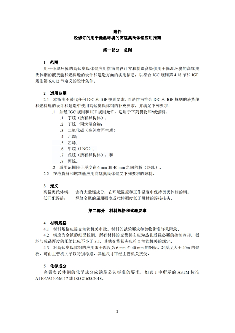 海安会MSC.1/Circ.1599/Rev.2通函(2022年6月15日)经修订的用于低温环境的高锰奥氏体钢应用指南(MSC.1/Circ.1599/Rev.1通函)1由于全球对液化天然气(LNG)这一环保能源的需求不断增长,以及LNG燃料船的建造和营运日趋增长,海上安全委员会在其第96届会议(2016年5月11日至20日)上同意确保LNG运输船和LNG燃料船的液货舱和燃料舱安全的需求,并指派货物和集装箱分委会通过制定IGC和IGF规则修正案的方式解决问题,从而包括用于低温环境的高锰奥氏体钢。2海上安全委员会在其第100届会议(2018年12月3日至7日)上认识到业界对用于低温环境的高锰奥氏体钢使用的不断增加和在此方面指导的需求,批准了用于低温环境的高锰奥氏体钢应用临时指南。3海上安全委员会在其第102届会议(2020年11月4日至11日)上批准了由货物和集装箱分委会在其第6次会议(2019年9月9日至13日)上制定的经修订的临时指南(MSC.1/Circ.1599/Rev.1通函)。4海上安全委员会在其第105届会议(2022年4月20日至29日)上批准了由货物和集装箱分委会在其第7次会议(2021年9月6日至10日)上制定的经修订的指南,其文本载于附件。5本委员会同意根据从应用获得的操作经验保持对经修订的指南的审议。6提请各成员国使所有相关方注意到经修订的指南。7本通函替代MSC.1Circ.1599/Rev.1.