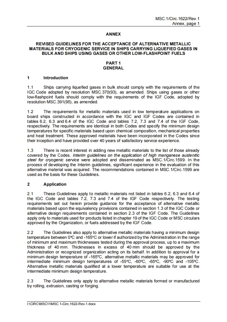 INTERNATIONALEMARITIMEORGANIZATION4 ALBERT EMBANKMENTLONDON SE1 7SRTelephone:+44(0)2077357611Fax:+44(0)2075873210MSC.1/Circ.1622/Rev.11Juy2024REVISED GUIDELINES FOR THE ACCEPTANCE OF ALTERNATIVE METALLICMATERIALS FOR CRYOGENIC SERVICE IN SHIPS CARRYING LIQUEFIED GASES INBULK AND SHIPS USING GASES OR OTHER LOW-FLASHPOINT FUELSThe Maritime Safety Committee,at its 102nd session (4 to 11 November 2020).acknowledging a potential need for alternative metallic materials to be used for the constructionand safe operation of low-temperature fuel and cargo-carrying ships and the need for guidancein this respect,approved the Guidelines for the acceptance of alternative metallic materials forcryogenic service in ships carrying liquefied gases in bulk and ships using gases or otherlow-flashpoint fuels (MSC.1/Circ.1622),prepared by the Sub-Committee on Carriage ofCargoes and Containers(CCC),at its sixth session(9 to 13 September 2019).The Maritime Safety Committee,at its 105th session(20 to 29 April 2022),approvedamendments to the Guidelines (MSC.1/Circ.1648),prepared by the Sub-Committee onCarriage of Cargoes and Containers(CCC),at its seventh session(6 to 10 September 2021).3The Maritime Safety Committee,at its 108th session (15 to 24 May 2024),havingqualified high manganese austenitic steel for ammonia service,and in order to revise additionalcompatibility test requirements for ammonia service,approved the Revised Guidelines for theacceptance of alternative metallic materials for cryogenic service in ships carrying liquefiedgases in bulk and ships using gases or other low-flashpoint fuels,as set out in the annex,prepared by the Sub-Committee on Carriage of Cargoes and Containers(CCC),at its ninthsession(20 to 29 September 2023).The Revised Guidelines incorporate the amendments in MSC.1/Circ.1648 andprovide detailed guidance on how to document alternative metallic materials for their suitabilityand compliance with the IGC and IGF Codes,and a framework for evaluation and approval ofalternative metallic materials for cryogenic service.5Member States are invited to bring the annexed Revised Guidelines to the attentionof all parties concerned.6This circular supersedes MSC.1/Circ.1622 and revokes MSC.1/Circ.1648.I:CIRCMSC1MSC 1-Circ.1622-Rev.1.docxNAVIGATINGTHE FUTURE:SAFETY FIRST!