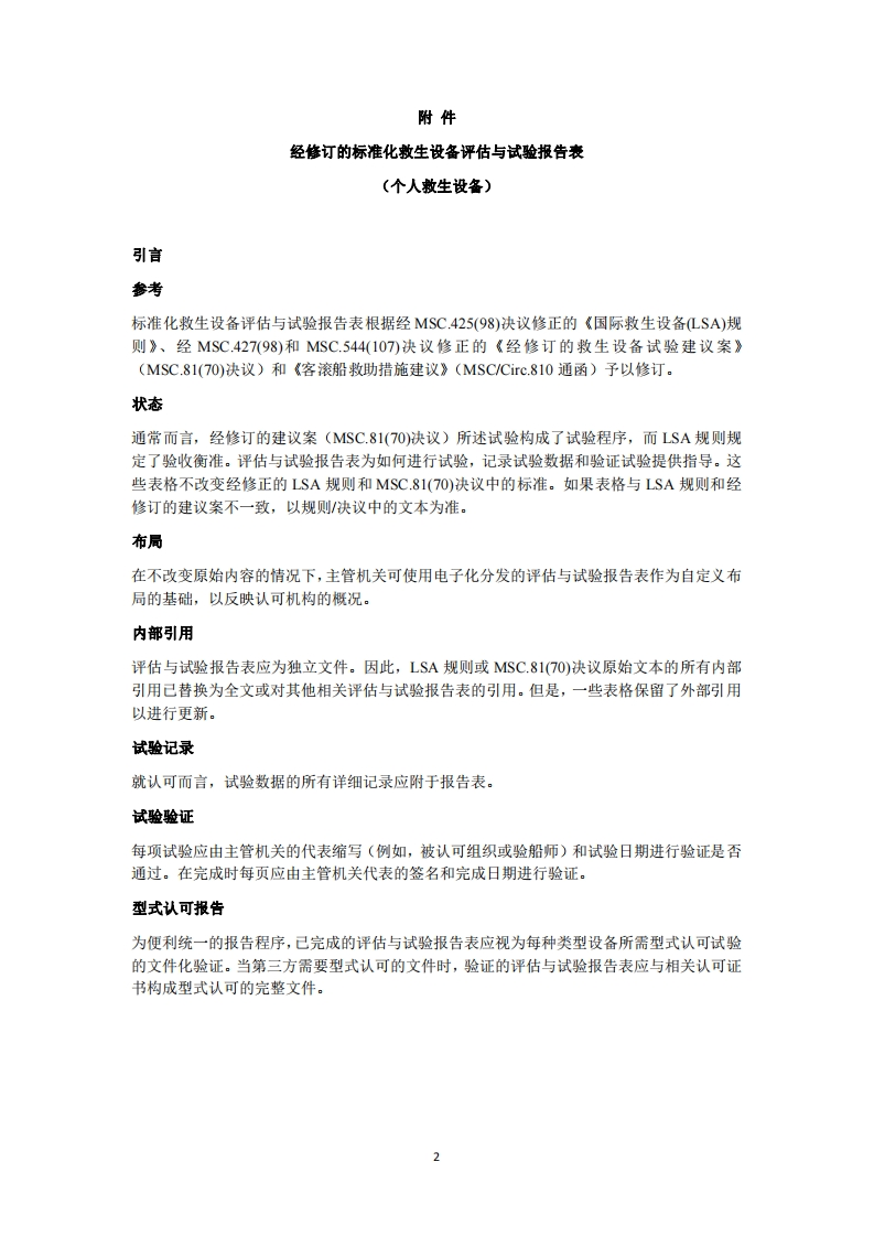 海安会MSC.1/Circ.l628/Rew.1通函(2023年7月10日)经修订的标准化救生设备评估与试验报告表(个人救生设备)1海上安全委员会在其第102届会议(2020年11月4日至11日)上,批准了《经修订的标准化救生设备评估与试验报告表》(MSC.1/Cic.1628)。2《标准化救生设备评估与试验报告表》(MSC/Cic.980通函)及其附录中的原始表格由海上安全委员会在其2001年的第73届会议上根据《国际救生设备(LSA)规则》和《经修订的救生设备试验建议案》(MSC.81(70)决议)的要求制定,旨在为如何进行试验,记录试验数据和验证试验提供指导。此后本委员会通过了LSA规则和MSC.81(70)决议的若干份修正案。这些修正案已纳入原始表格,但因篇幅所限,现分为六份通函,即MSC.1Cic.1628、MSC.1/Circ.1629、MSC.1/Circ.1630、MSC.1/Circ.1631、MSC.1℃ire.1632和MSC.1/Circ.1633分别对应LSA规则第Ⅱ章至第VI章所述的设备。本通函所附表格适用于LSA规则第Ⅱ章所述设备,即个人救生设备(救生圈和相关设备:救生衣和相关设备:救生服和相关设备:抗暴露服:和保温用具)。3本委员会在其第107届会议(2023年5月31日至6月9日)上,批准了评估与试验报告表的修正草案(源于MSC.81(70)决议关于带体温的人体模型试验的修正案),以MSC.1/Circ.1628Rev.1通函分发。《经修订的标准化救生设备评估与试验报告表(个人救生设备)》的文本载于附件。4使用经修订的表格将继续使主管机关和其他方(例如制造商、试验设施、船东和验船师)受益,并在其他主管机关认可的设备型式认可的互认方面起重要作用。5请各成员国政府使认可、制造和试验救生设备的有关各方注意所附的经修订的表格,并鼓励其使用表格。6本通函代替MSC.1/Circ.1628通函。