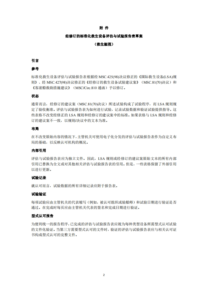 海安会MSC.1/Cire.I630/Rey.1通函(2022年12月3日)经修订的标准化救生设备评估与试验报告表(救生艇筏)1海上安全委员会在其第102届会议(2020年11月4日至11日)上,批准了《经修订的标准化救生设备评估与试验报告表》。2《标准化救生设备评估与试验报告表》(MSC/Cic.980通函)及其附录中的原始表格由海上安全委员会在其2001年的第73届会议上根据《国际救生设备(LSA)规则》和《经修订的救生设备试验建议案》(MSC.81(70)决议)的要求制定,旨在为如何进行试验,记录试验数据和验证试验提供指导。此后本委员会通过了LSA规则和MSC.81(70)决议的若干份修正案。这些修正案已纳入原始表格,但因篇幅所限,现分为六份通函,即MSC.1/Cic.1628、MSC.1/Circ.1629、MSC.1/Circ.1630、MSC.1/Circ.1631、MSC.1℃irc.1632和MSC.1/Circ.1633,分别对应LSA规则第Ⅱ章至第VⅡ章所述的设备。3为解决对《经修订的标准化救生设备评估与试验报告表(救生艇筏)》(MSC.1/Ci心.1630通函)的“对膜片的技术试验”,“疏松度”和“耐油”中己撤销标准的引用更新的需要,本委员会在其第106届会议(2022年11月2日至11日)上,批准了上述评估与试验报告表的修正案,以MSC.l/Circ.1630/Rev.1通函分发。《经修订的标准化救生设备评估与试验报告表(救生艇筏)》的文本载于附件。4本通函所附表格适用于LSA规则第V章所述设备,即救生艇筏(气胀式救生筏:刚性救生筏:救生艇筏组件:吊放式救生艇:和自由降落救生艇)。5使用经修订的表格将继续使主管机关和其他方(例如制造商、试验设施、船东和验船师)受益,并在其他主管机关认可的设备型式认可的互认方面起重要作用。6请各成员国政府使认可、制造和试验救生设备的有关各方注意所附的经修订的表格,并鼓励其使用表格。7本通函代替MSC.1℃ic.1630通函.
