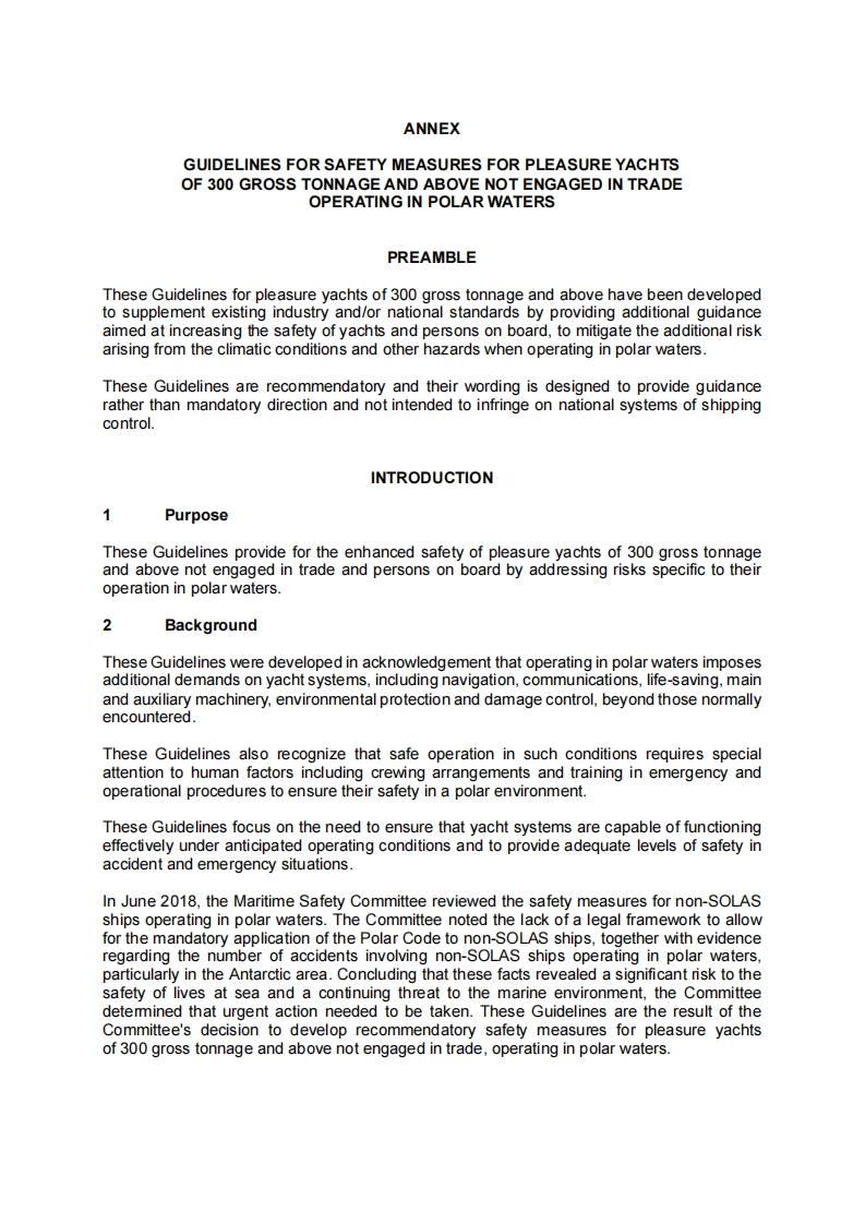 MSC.1/Circ.164214May2021GUIDELINES FOR SAFETY MEASURES FOR PLEASURE YACHTSOF 300 GROSS TONNAGE AND ABOVE NOT ENGAGEDIN TRADE OPERATING IN POLAR WATERS1 The Maritime Safety Committee,at its 103rd session(5 to 14 May 2021),approvedthe Guidelines for safety measures for pleasure yachts of 300 gross tonnage and above notengaged in trade operating in polar waters,as set out in the annex,prepared by the Sub-Committee on Ship Design and Construction,at its seventh session (3 to 7 February 2020).2 Member States are invited to use the annexed Guidelines and to bring them to theattention of all parties concemed.