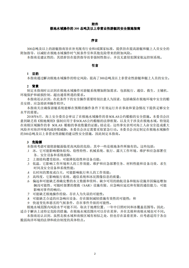 MSC.1-Circ.1642-极地水域操作的300总吨及以上非营业性游艇的安全措施指南(247)348072@abc4个月前发布关注私信0.44MB14页027MSC.1-Circ.1642-极地水域操作的300总吨及以上非营业性游艇的安全措施指南(247)此内容为付费资源,请付费后查看¥13¥23黄金会员免费钻石会员免费立即购买您当前未登录!建议登陆后购买,可保存购买订单付费资源 第1页 / 共14页 第2页 / 共14页 试读已结束,还剩12页,您可下载完整版后进行离线阅读 THE END标准规范 文本预览 海安会MSC.1/Circ.1642通函(2021年5月14日)极地水域操作的300总吨及以上非营业性游艇的安全措施指南1海上安全委员会在其第103届会议(2021年5月5日至14日)上,批准了船舶设计和建造分委会在其第7次会议(2020年2月3日至7日)上制定的《极地水域操作的300总吨及以上非营业性游艇的安全措施指南》,其文本载于附件。2提请各成员国政府使用所附的指南并使所有相关方注意所附的指南。 查看更多 收起部分 喜欢就支持一下吧收藏