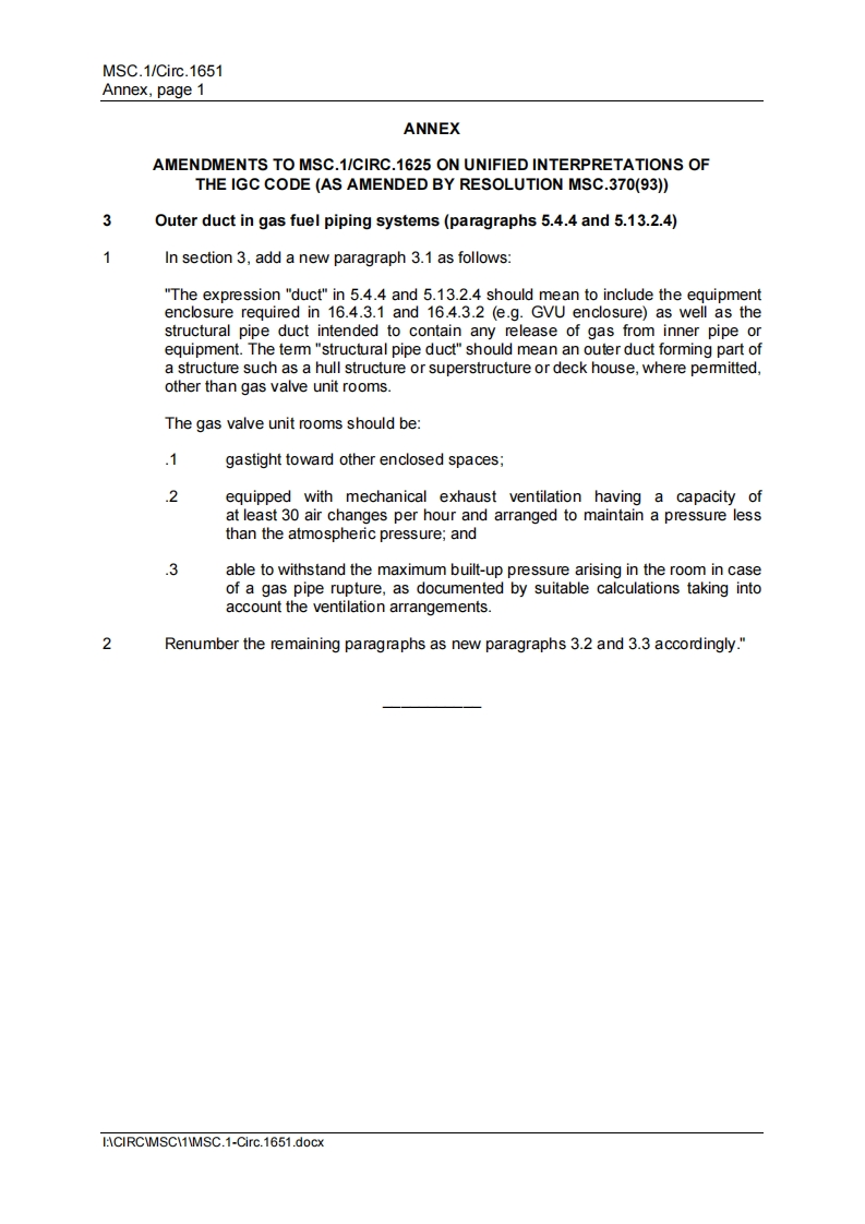 INTERNATIONALEMARITIMEORGANIZATION4 ALBERT EMBANKMENTLONDON SE1 7SRTelephone:+44(0)2077357611Fax:+44(0)2075873210MSC.1/Circ.165115June2022AMENDMENTS TO MSC.1/CIRC.1625 ON UNIFIED INTERPRETATIONSOF THE IGC CODE(AS AMENDED BY RESOLUTION MSC.370(93))1The Maritime Safety Committee,at its 105th session(20 to 29 April 2022),with a viewto providing more specific guidance for the application of the relevant requirements of theInternational Code for the Construction and Equipment of Ships Carrying Liquefied Gases inBulk (IGC Code),as amended by resolution MSC.370(93),approved amendments to theUnified interpretations of the IGC Code (as amended by resolution MSC.370(93))(MSC.1/Circ.1625),containing unified interpretations of the term "duct"in paragraphs 5.4.4and 5.13.2.4 of the IGC Code,prepared by the Sub-Committee on Carriage of Cargoes andContainers,at its seventh session,as set out in the annex.2Member States are invited to use the annexed amendments in conjunction with theunified interpretations set out in MSC.1/Circ.1625 when applying relevant provisions of the IGCCode and to bring them to the attention of all parties concemed.女女出I:CIRCMSC1SC.1-Circ.1651.docx通SHIPPING