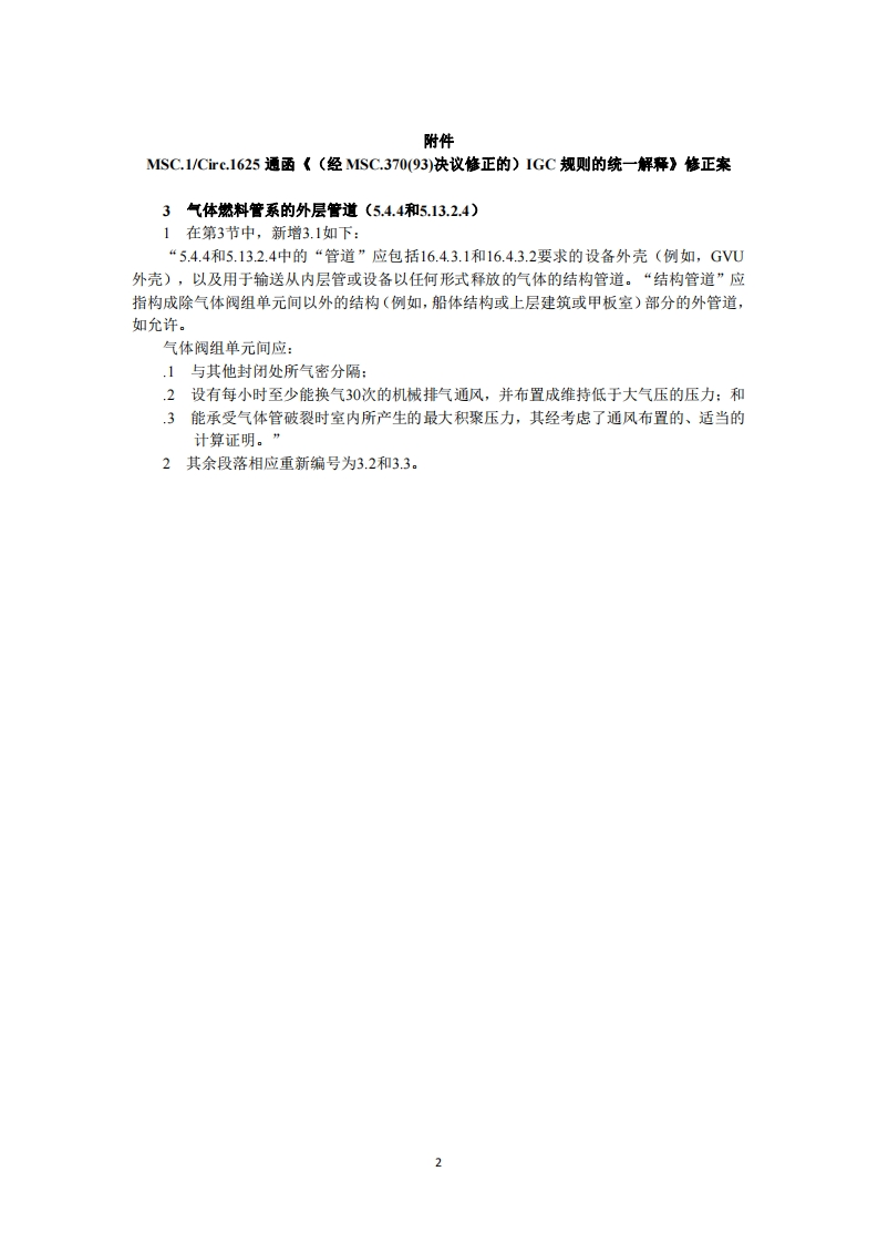 海安会MSC.1/Circ.1651通函(2022年6月15日)MSC.1/Circ.1625通函《(经MSC.370(93)决议修正的)IGC规则的统一解释》修正案1海上安全委员会在其第105届会议(2022年4月20日至29日)上,为了对经MSC.370(93)决议修正的《国际散装运输液化气体船舶构造和设备规则》(IGC规则)相关要求的应用提供更具体的指导,批准了货物和集装箱运输分委会在其第7次会议上制定的(经MSC.370(93)决议修正的)IGC规则的统一解释(MSC.1/Ci心.1625通函)修正案,包括对IGC规则5.4.4和5.132.4中的术语“管道”的统一解释,其文本载于附件。2提请各成员国政府在应用IGC规则的相关规定时,结合使用所附的修正案和MSC.1/Crc.1625通函的统一解释,并使所有相关方注意该统一解释。