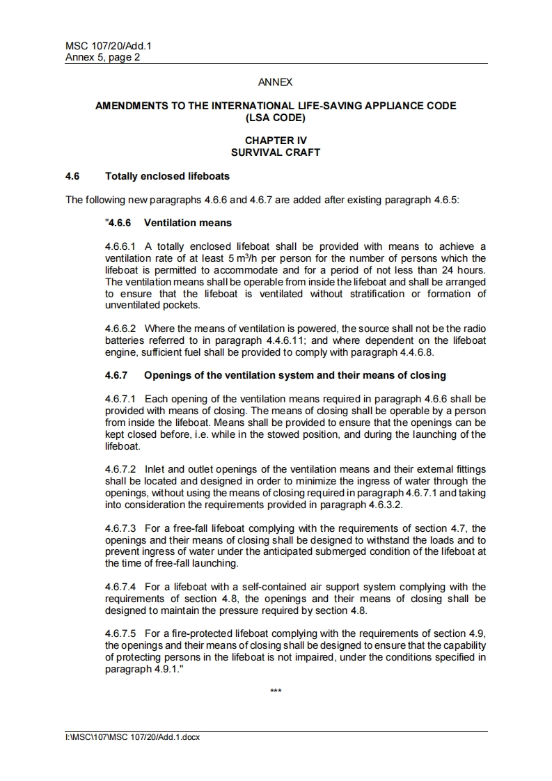 MSC107/20/Add.1Annex 5,page 1ANNEX 5RESOLUTION MSC.535(107)(adopted on 8 June 2023)AMENDMENTS TO THE INTERNATIONAL LIFE-SAVING APPLIANCE CODE(LSA CODE)THE MARITIME SAFETY COMMITTEE.RECALLING Article 28(b)of the Convention on the International Maritime Organizationconcerning the functions of the Committee,RECALLING ALSO resolution MSC.48(66),by which it adopted the International Life-SavingAppliance (LSA)Code ("the LSA Code"),which has become mandatory under chapter Ill ofthe International Convention for the Safety of Life at Sea(SOLAS),1974 ("the Convention"),RECALLING FURTHER article VIll(b)and regulation Ill/3.10 of the Convention concerning theprocedure for amending the LSA Code,HAVING CONSIDERED,at its 107th session,amendments to the LSA Code proposed andcirculated in accordance with article VIll(b)(i)of the Convention,1ADOPTS,in accordance with article VIll(b)(iv)of the Convention,amendments to theLSA Code,the text of which is set out in the annex to the present resolution;DETERMINES,in accordance with article VIll(b)(vi)(2)(bb)of the Convention,that theamendments shall be deemed to have been accepted on 1 July 2025 unless,prior to that date,more than one third of the Contracting Governments to the Convention or ContractingGovernments,the combined merchant fleets of which constitute not less than 50%of the grosstonnage of the world's merchant fleet,have notified their objections to the amendments;3INVITES Contracting Governments to note that,in accordance witharticle VIll(b)(vii)(2)of the Convention,the amendments shall enter into forceon 1 January 2026 upon their acceptance in accordance with paragraph 2 above;4ALSO INVITES Contracting Government to note that the provisions in the annex areto be applied to totally enclosed lifeboats installed on or after 1 January 2029 where theexpression installed on or after 1 January 2029 means:(a)for ships for which the building contract is placed on or after 1 January 2029,or in the absence of the contract,constructed on or after 1 January 2029,any installation date on the ship;or(b)for ships other than those ships prescribed in (a)above,a contractualdelivery date for the equipment or,in the absence of a contractual deliverydate,the actual delivery date of the equipment to the ship on orafter 1 January 2029.5REQUESTS the Secretary-General,in conformity with article VIll(b)(v)of theConvention,to transmit certified copies of the present resolution and the text of theamendments contained in the annex to all Contracting Governments to the Convention;6ALSO REQUESTS the Secretary-General to transmit copies of this resolution and itsannex to Members of the Organization which are not Contracting Governments to theConvention.I:MSC107MSC 107/20/Add.1.docx