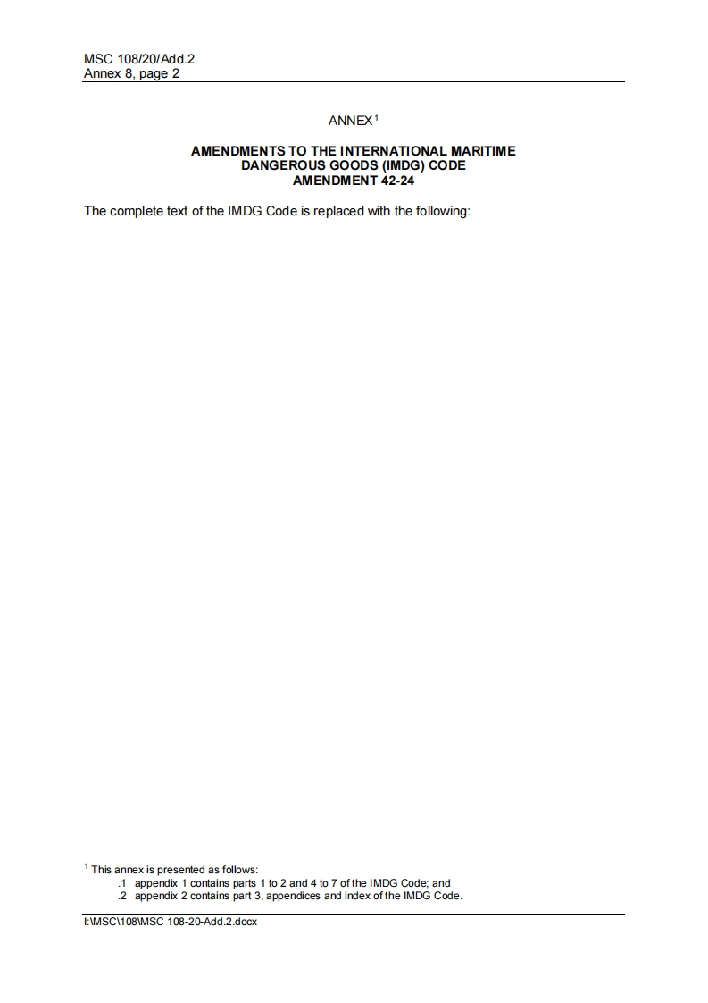 MSC108/20/Add.2Annex 8,page 1ANNEX 8RESOLUTION MSC.556(108)(adopted on 23 May 2024)AMENDMENTS TO THEINTERNATIONAL MARITIME DANGEROUS GOODS (IMDG)CODETHE MARITIME SAFETY COMMITTEERECALLING Article 28(b)of the Convention on the International Maritime Organizationconcerning the functions of the Committee,RECALLING ALSO resolution MSC.122(75)by which it adopted the International MaritimeDangerous Goods Code (hereinafter referred to as "the IMDG Code"),which has becomemandatory under chapter Vll of the International Convention for the Safety of Life at Sea(SOLAS),1974,as amended (hereinafter referred to as "the Convention"),RECALLING FURTHER article VIll(b)and regulation VIl/1.1 of the Convention concerning theprocedure for amending the IMDG Code,HAVING CONSIDERED,at its 108th session,amendments to the IMDG Code,proposed andcirculated in accordance with article VIll(b)(i)of the Convention,ADOPTS,in accordance with article VIll(b)(iv)of the Convention,amendments to theIMDG Code,the text of which is set out in the annex to the present resolution;2DETERMINES,in accordance with article VIll(b)(vi)(2)(bb)of the Convention,that thesaid amendments shall be deemed to have been accepted on 1 July 2025,unless prior to thatdate more than one third of the Contracting Governments to the Convention or ContractingGovernments the combined merchant fleets of which constitute not less than 50%of the grosstonnage of the world's merchant fleet,have notified their objections to the amendments;3INVITES Contracting Governments to the Convention to note that,in accordancewith article Vlll(b)(vii)(2)of the Convention,the amendments shall enter into forceon 1 January 2026 upon their acceptance in accordance with paragraph 2 above;4AGREES that Contracting Governments to the Convention may apply theaforementioned amendments in whole or in part on a voluntary basis from 1 January 2025;REQUESTS the Secretary-General,for the purposes of article VIll(b)(v)of theConvention,to transmit certified copies of the present resolution and the text of theamendments contained in the annexes to all Contracting Governments to the Convention;6ALSO REQUESTS the Secretary-General to transmit copies of this resolution and itsannexes to Members of the Organization which are not Contracting Governments to theConvention.I:MSC108MSC 108-20-Add.2.docx