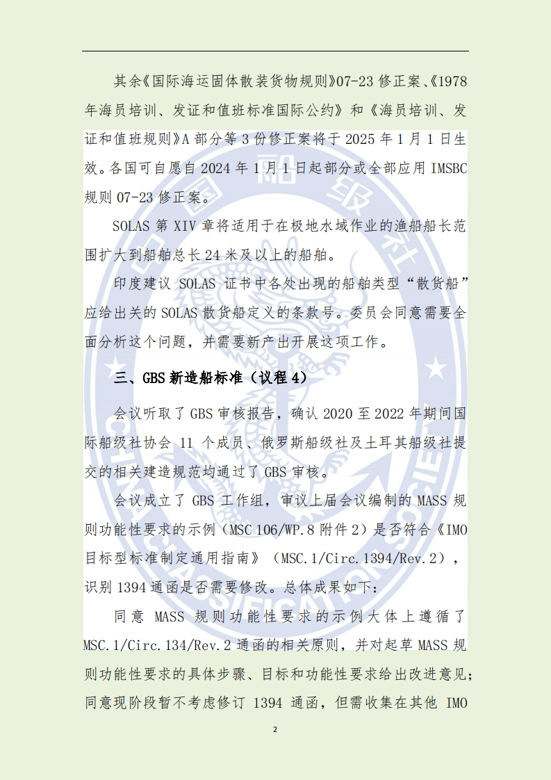 IM0海上安全委员会第107届会议要点快报2023年6月11日国际海事组织(IM0)海上安全委员会第107届会议于2023年5月31日至6月9日在英国伦敦IM0总部召开。会议由美国Mayte Medina女士担任主席。会议主要议程包括:审议强制性文件修正案、GBS新造船标准、海上水面自主航行船舶安全标准、综合安全评估、工作计划等,并审议相关分委会事项。相关情况概要如下:一、其他机构的决定(议程2)关于参会问题,成员国代表无论在IM0会议大厅还是注册为远程参加IMO会议,均认为参加了IM0会议,但秘密投票只能只能亲临现场投票。审议强制性文件修正案(议程3)本届会议审议通过了10份强制性文件强制性文件修正案。包括《1974年S0LAS公约》及其1978议定书和1988议定书、《国际救生设备规则》、1994和2000年《国际高速船安全规则》和《国际极地水域航行船舶规则》等在内的7份修正案将于2026年1月1日生效,其中《国际救生设备规则》修正案应用于2029年1月1日或之后安装上船的全封闭救生艇。