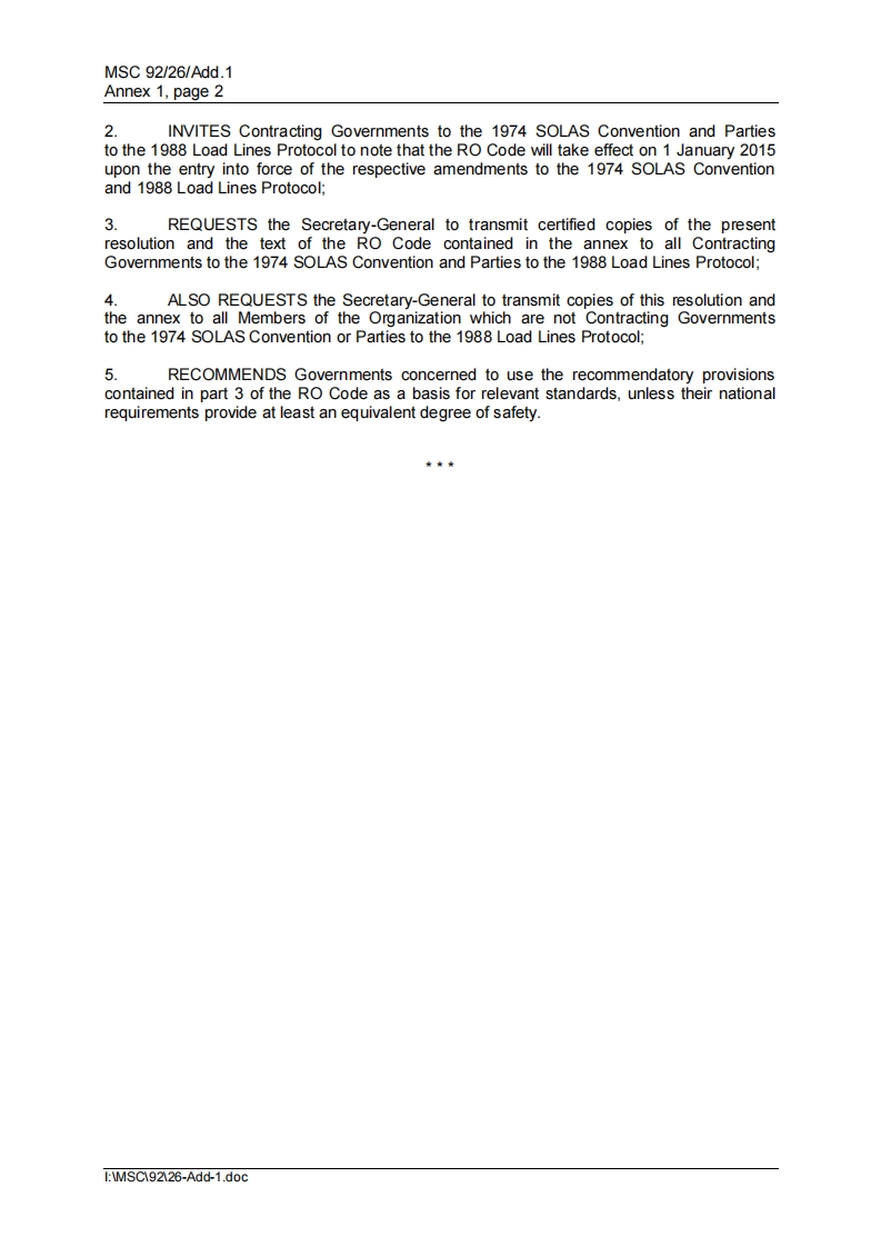 MSC 92/26/Add.1Annex 1,page 1ANNEX 1RESOLUTION MSC.349(92)(Adopted on 21 June 2013)CODE FOR RECOGNIZED ORGANIZATIONS(RO CODE)THE MARITIME SAFETY COMMITTEE.RECALLING Article 28(b)of the Convention on the International Maritime Organizationconcerning the functions of the Committee,RECALLING ALSO resolution A.739(18)entitled Guidelines for the authorization oforganizations acting on behalf of the Administration,as amended by resolution MSC.208(81),and resolution A.789(19)entitled Specifications on the survey and certification functions ofrecognized organizations acting on behalf of the Administration,which have becomemandatory under chapter XI-1 of the International Convention for the Safety of Life at Sea(SOLAS),1974(hereinafter referred to as "the 1974 SOLAS Convention"),under chapter I ofannex I to annex B of the Protocol of 1988 relating to the International Convention on LoadLines,1966(hereinafter referred to as "the 1988 Load Lines Protocol"),and under Annex Iand Annex ll of the MARPOL Convention,RECOGNIZING the need to update the aforementioned resolutions,gather all the applicablerequirements for recognized organizations in a single IMO mandatory instrument and assistin achieving harmonized and consistent global implementation of requirements establishedby IMO instruments for the assessment and authorization of recognized organizations.RECOGNIZING ALSO the need for a code to provide,as far as national laws allow,a standard approach to assist the Administrations in meeting their responsibilitiesin recognizing,authorizing and monitoring their recognized organizations,NOTING resolutions MSC.350(92)and MSC.356(92),by which it adopted,inter alia,amendments to the 1974 SOLAS Convention and to the 1988 Load Lines Protocol,respectively,to make the provisions of part 1 and part 2 of the Code for recognized organizations mandatoryunder the 1974 SOLAS Convention and the 1988 Load Lines Protocol,NOTING ALSO resolution MEPC.237(65)by which the Marine Environment ProtectionCommittee adopted the Code for recognized organizations to be made mandatory underannex I and annex ll of the Protocol of 1978 relating to the Intemational Convention for thePrevention of Pollution from Ships,1973,HAVING CONSIDERED,at its ninety-second session,the text of the proposed Code forrecognized organizations,CONSIDERING that it is highly desirable for the Code for recognized organizationsmade mandatory under the MARPOL Convention,the 1974 SOLAS Convention andthe 1988 Load Lines Protocol to remain identical,1.ADOPTS the Code for recognized organizations (RO Code),the text of which isset out in the annex to the present resolution;I:MSC92126-Add-1.doc