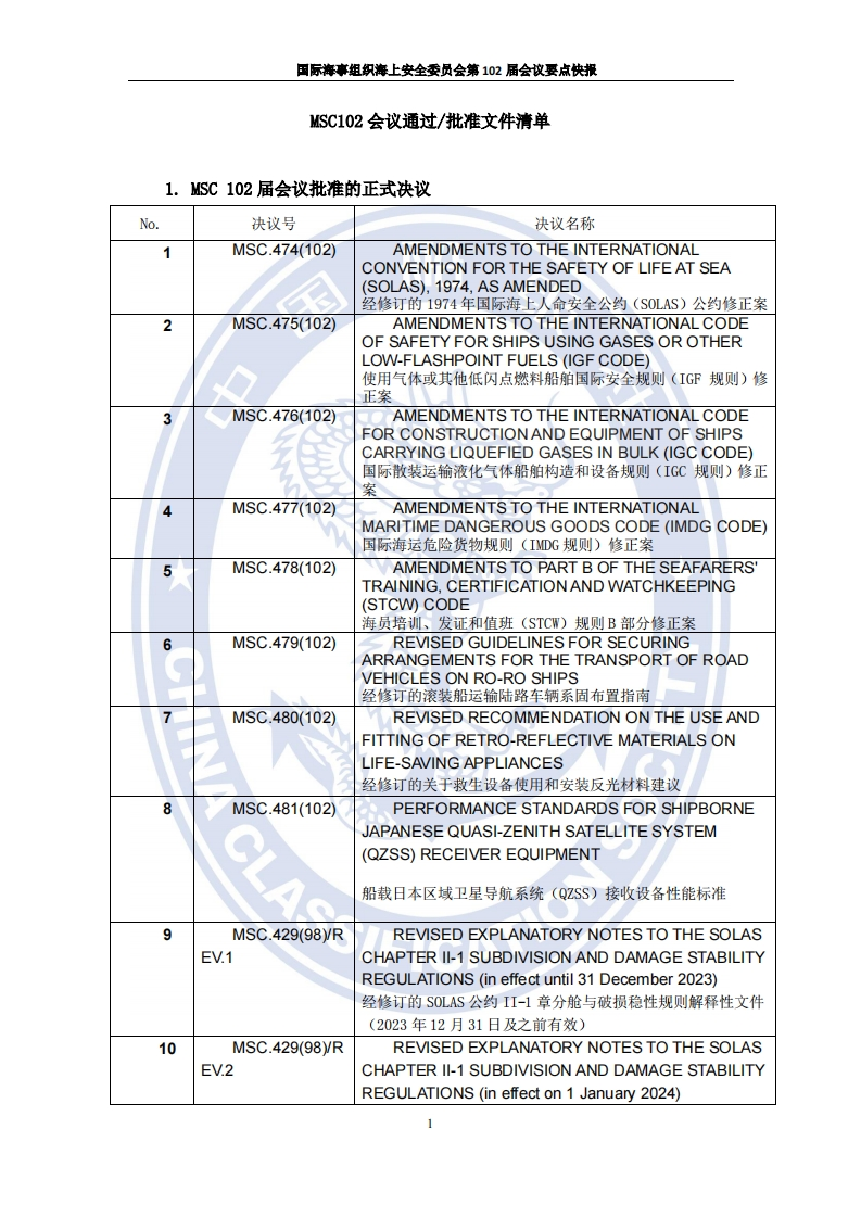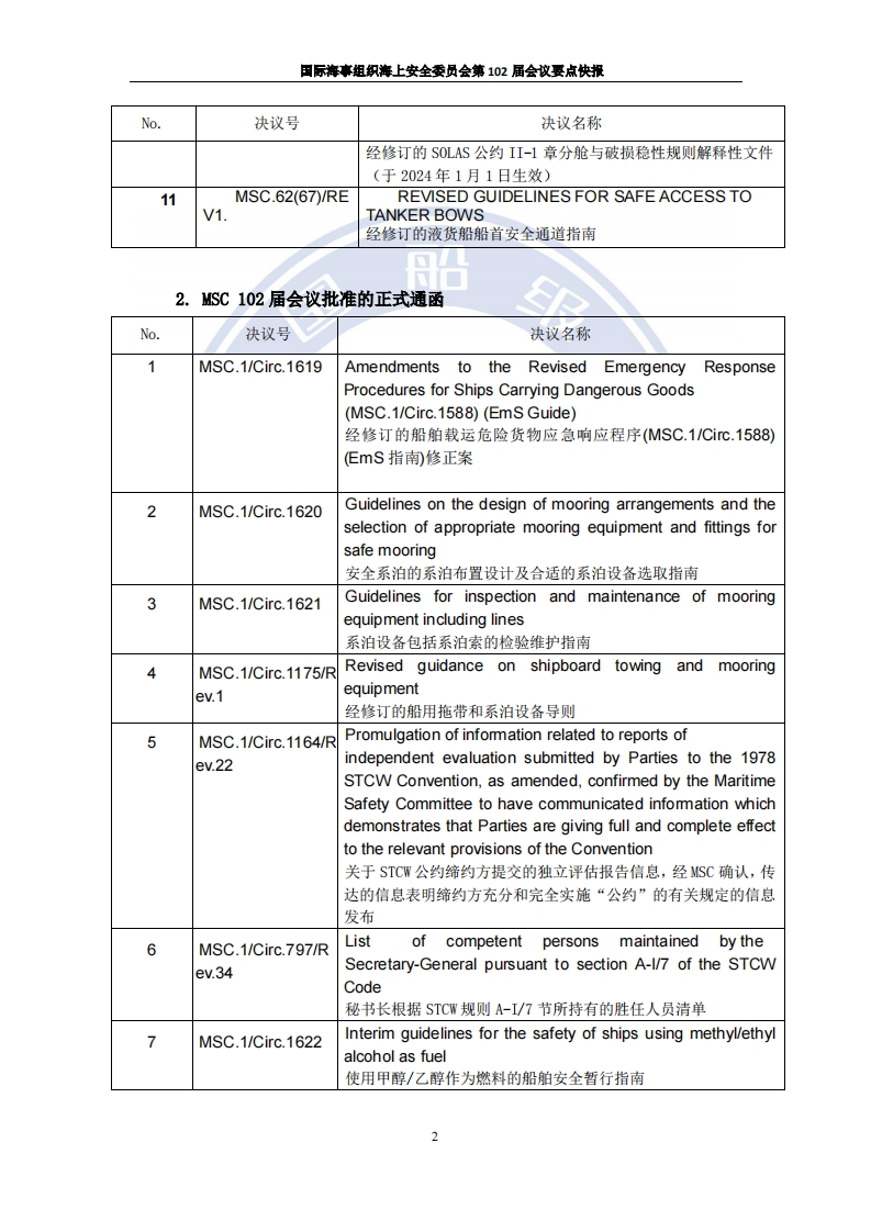 国际海事组织海上安全委员会第102届会议要点快报MSC102会议通过/批准文件清单1.MSC102届会议批准的正式决议No.决议号决议名称1MSC.474(102)AMENDMENTS TO THE INTERNATIONALCONVENTION FOR THE SAFETY OF LIFE AT SEA(SOLAS),1974,AS AMENDED经修订的1974年国际海上人命安全公约(S0LAS)公约修正案2MSC.475(102)AMENDMENTS TO THE INTERNATIONAL CODEOF SAFETY FOR SHIPS USING GASES OR OTHERLOW-FLASHPOINT FUELS(IGF CODE)使用气体或其他低闪点燃料船舶国际安全规则(IGF规则)修正案3MSC.476(102)AMENDMENTS TO THE INTERNATIONAL CODEFOR CONSTRUCTIONAND EQUIPMENT OF SHIPSCARRYING LIQUEFIED GASES IN BULK(IGC CODE)国际散装运输液化气体船舶构造和设备规则(IGC规则)修正案4MSC.477(102)AMENDMENTS TO THE INTERNATIONALMARITIME DANGEROUS GOODS CODE (IMDG CODE)国际海运危险货物规则(IMDG规则)修正案5MSC.478(102)AMENDMENTS TO PART B OF THE SEAFARERS'TRAINING,CERTIFICATION AND WATCHKEEPING(STCW)CODE海员培训、发证和值班(STCW)规则B部分修正案6MSC.479(102)REVISED GUIDELINES FOR SECURINGARRANGEMENTS FOR THE TRANSPORT OF ROADVEHICLES ON RO-RO SHIPS经修订的滚装船运输陆路车辆系固布置指南MSC.480(102)REVISED RECOMMENDATION ON THE USE ANDFITTING OF RETRO-REFLECTIVE MATERIALS ONLIFE-SAVING APPLIANCES经修订的关于救生设备使用和安装反光材料建议8MSC.481(102)PERFORMANCE STANDARDS FOR SHIPBORNEJAPANESE QUASI-ZENITH SATELLITE SYSTEM(QZSS)RECEIVER EQUIPMENT船载日本区域卫星导航系统(QZSS)接收设备性能标准9MSC.429(98)/RREVISED EXPLANATORY NOTES TO THE SOLASEV.1CHAPTER II-1 SUBDIVISION AND DAMAGE STABILITYREGULATIONS (in effect until 31 December 2023)经修订的S0LAS公约II-1章分舱与破损稳性规则解释性文件(2023年12月31日及之前有效)10MSC.429(98)VRREVISED EXPLANATORY NOTES TO THE SOLASEV.2CHAPTER II-1 SUBDIVISION AND DAMAGE STABILITYREGULATIONS (in effect on 1 January 2024)