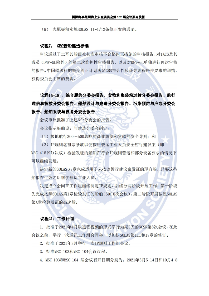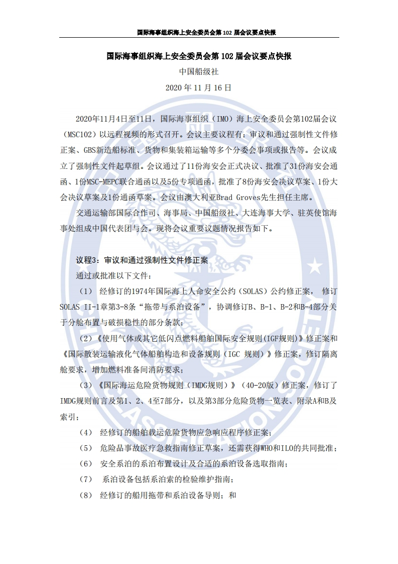 国际海事组织海上安全委员会第102届会议要点快报国际海事组织海上安全委员会第102届会议要点快报中国船级社2020年11月16日2020年11月4日至11日,国际海事组织(IM0)海上安全委员会第102届会议(MSC102)以远程视频的形式召开。会议主要议程有:审议和通过强制性文件修正案、GBS新造船标准、货物和集装箱运输等多个分委会事项或报告等。会议成立了强制性文件起草组。会议通过了11份海安会正式决议、批准了31份海安会通函、1份MSC-EPC联合通函以及5份专项通函,批准了8份海安会决议草案、1份大会决议草案及1份通函草案。会议由澳大利亚Brad Groves先生担任主席。交通运输部国际合作司、海事局、中国船级社、大连海事大学、驻英使馆海事处组成中国代表团与会。现将会议重要议题情况报告如下。议程3:审议和通过强制性文件修正案通过或批准以下文件:(1)经修订的1974年国际海上人命安全公约(S0LAS)公约修正案,修订S0 LAS II-1章第3-8条“拖带与系泊设备”,协调修订B、B-1、B-2和B-4部分关于分舱布置与破损稳性的部分条款:(2)《使用气体或其它低闪点燃料船舶国际安全规则(1GF规则)》修正案和《国际散装运输液化气体船舶构造和设备规则(IGC规则)》修正案,修订隔离舱要求,增加燃料准备间消防要求:(3)《国际海运危险货物规则(IDG规则)》(40-20版)修正案,修订了IMDG规则前言及第1、2、4至7部分,以及第3部分危险货物一览表、附录A和B及索引:(4)经修订的船舶载运危险货物应急响应程序修正案:(5)危险品事故医疗急救指南修正草案,还需获得WHO和IL0的共同批准:(6)安全系泊的系泊布置设计及合适的系泊设备选取指南:(7)系泊设备包括系泊索的检验维护指南:(8)经修订的船用拖带和系泊设备导则:和