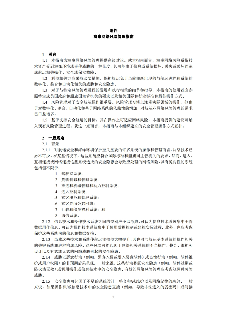 MSC-FALl/Circ3/Rev.l1通函(2021年6月14日)海事网络风险管理指南1便利委员会在其第41届会议(2017年4月4日至7日)和海上安全委员会在其第98届会议(2017年6月7日至16日)上,审议了增强网络风险威胁和安全隐患意识的迫切需求,批准了海事网络风险管理指南,其文本载于附件。2本指南提供关于海事网络风险管理的高级建议,以保护航运免于当前和新出现的网络威胁和安全隐患的危害。本指南也包括支持有效网络风险管理的功能要素。3海上安全委员会在其第103届会议(2021年5月5日至14日)和便利委员会在其第45届会议(2021年6月1日至7日)上,批准了对本指南第4.2段中附加导则和标准的更新。4提请各成员国使所有相关利益方注意到本通函的内容。5本通函和任何修订取代MSC.1Circ.1526通函中包含的暂行指南。