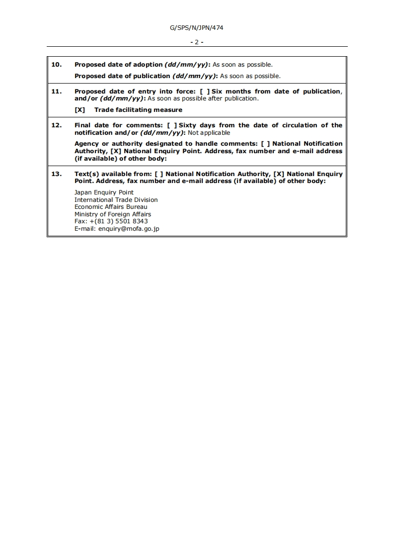 WORLD TRADEG/SPS/N/JPN/474ORGANIZATION25 August 2016(16-4534)Page:1/2Committee on Sanitary and Phytosanitary MeasuresOriginal:EnglishNOTIFICATIONNotifying Member:JAPANIf applicable,name of local government involved:Agency responsible:Ministry of Health,Labour and Welfare(MHLW)Products covered (provide tariff item number(s)as specified in nationalschedules deposited with the WTO;ICS numbers should be provided inaddition,where applicable):Food additive (Hypobromous acid water)Regions or countries likely to be affected,to the extent relevant or practicable:[X]All trading partners[]Specific regions or countries:Title of the notified document:Amendment to the Enforcement Ordinance of theFood Sanitation Law and the Standards and Specifications for Foods and Food AdditivesLanguage(s):English Number of pages:4http://members.wto.orq/crnattachments/2016/SPS/PN/16 3500 00 e.pdfDescription of content:Authorization of Hypobromous acid water as food additive andestablishment of standards and specifications.1:Objective and rationale:[X]food safety,animal health,plant protection,protect humans from animal/plant pest or disease,protect territory fromother damage from pests.8.Is there a relevant international standard?If so,identify the standard:[]Codex Alimentarius Commission (e.g.title or serial number of Codexstandard or related text)[]World Organization for Animal Health (OIE)(e.g.Terrestrial or AquaticAnimal Health Code,chapter number)[]International Plant Protection Convention (e.g.ISPM number)[X]NoneDoes this proposed regulation conform to the relevant international standard?[]Yes []NoIf no,describe,whenever possible,how and why it deviates from theinternational standard:Other relevant documents and language(s)in which these are available:Food Sanitation Law.When adopted,this amendment will be published in Kampo,theofficial Japanese Governmental Gazette (available in Japanese).