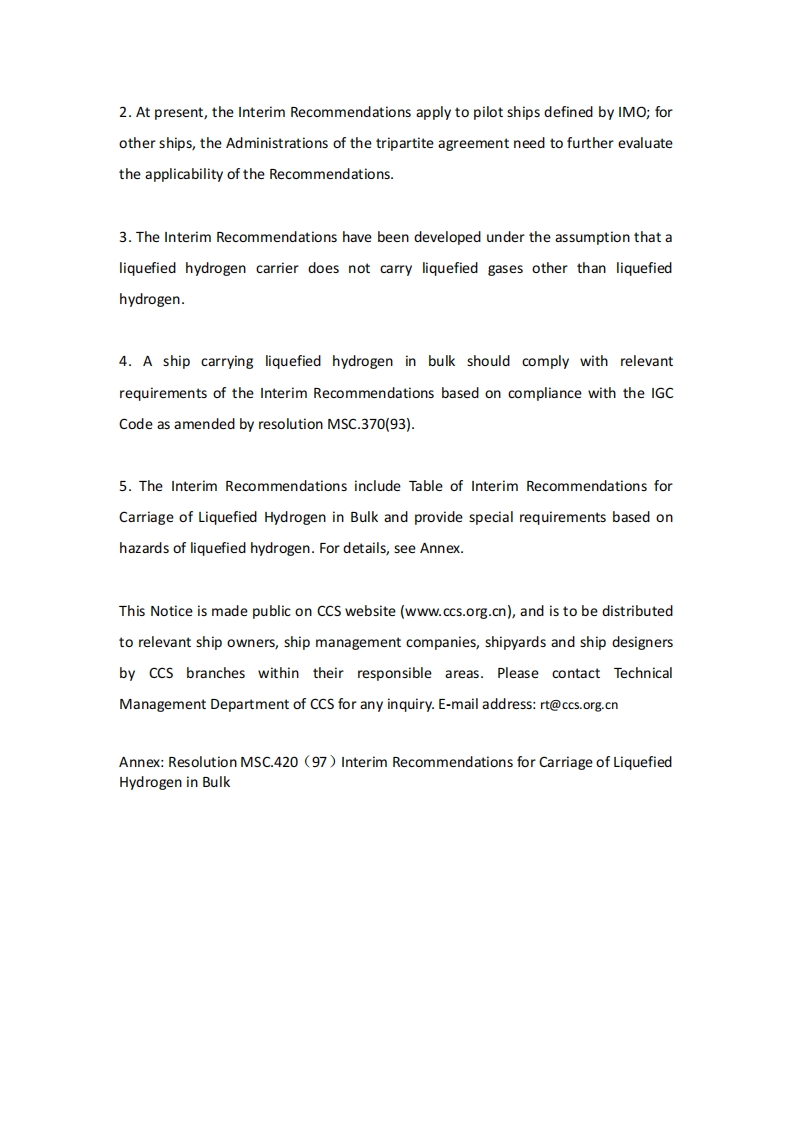 CCSTechnical Information(2017)Technical Information No.61 Total No.309Aug.15,2017(Total 2 pages)To:relevant departments of CCS Headquarters,CCS surveyors,plan approval centers,relevantship owners,shipyards and designersNotice on Interim Recommendations for Carriage of LiquefiedHydrogen in Bulk(Resolution MSC.420(97))Issued by IMOI BackgroundThe International Code for the Construction and Equipment of Ships CarryingLiquefied Gases in Bulk (IGC Code)currently does not specifically providerequirements for carriage of liquefied hydrogen in bulk by sea.In order to satisfy theneed of the industry for carriage of liquefied hydrogen in bulk,InternationalMaritime Organization (IMO)developed requirements for carriage of liquefiedhydrogen,and decided to adopt and release Interim Recommendations for Carriageof Liquefied Hydrogen in Bulk by resolution MSC.420(97)prior to Amendments to IGCCode for the inclusion of liquefied hydrogen.The Interim Recommendations may befurther improved based on the practical experience and feedback gained through theapplication of the Interim Recommendations.ll Main contents and matters needing attention1.Liquefied hydrogen is not listed in Chapter 19 of IGC Code,and it can only becarried with the establishment of a tripartite agreement according to paragraph1.1.6.1 of IGC Code.The Interim Recommendations may be treated as the basis oftripartite agreement of interim condition of carriage established by theAdministrations for gas carriers carrying only liquefied hydrogen in bulk.