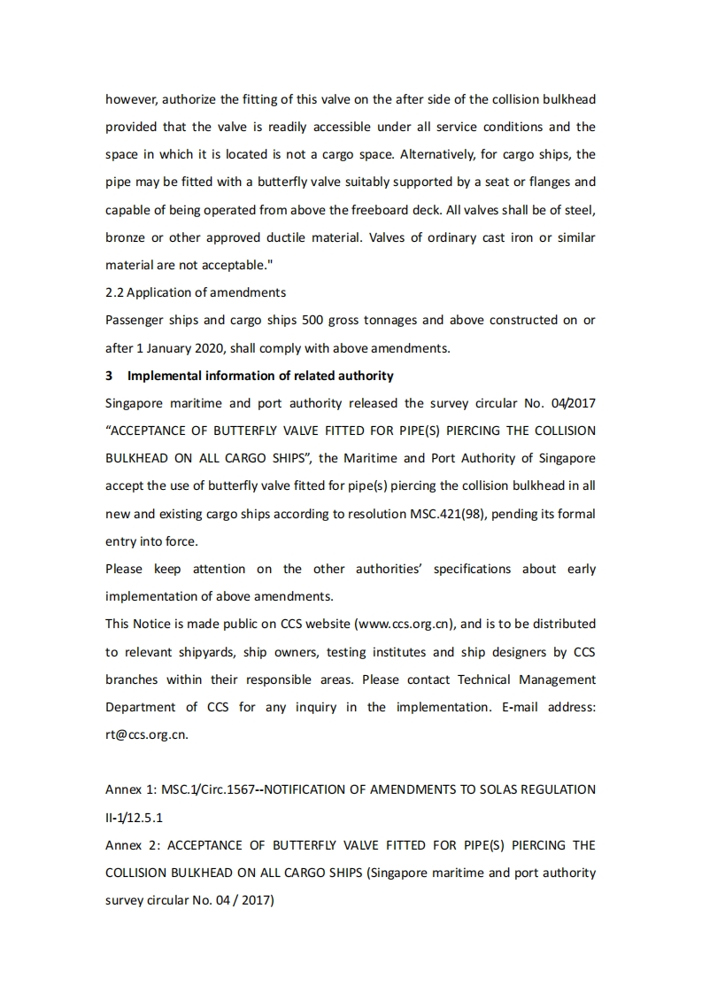 CCSTechnical Information(2017)Technical Information No.77 Total No.325Dec.29,2017(Total 2 pages+Annex)To:Relevant departments of the Headquarters of CCS,the Society's surveyors,PlanApproval Centers,related shipowners,ship management companies,shipyards anddesignersNotice on issuance of MSC.1/Circ.1567 "NotificationofAmendments to SOLAS Regulation Il-1/12.5.1"by IMO1 BackgroundThe Maritime Safety Committee,at its ninety-eighth session(7 to 16 June 2017),adopted amendments to SOLAS regulations ll-1/12.5.1,by resolution MSC.421(98).Inview of the above amendment which is expected to enter into force on 1 January2020,the Maritime Safety Committee approved MSC.1/Circ.1567 "NOTIFICATION OFAMENDMENTS TO SOLAS REGULATION II-1/12.5.1".Member States are invited to takeaction,as appropriate,pending its formal entry into force.Member States are invitedto bring the above information to the attention of all parties concerned.2 Main point2.1 Amendments to SOLAS regulation ll-1/12.5.1Replace the existing paragraph 5.1 of SOLAS regulation ll-1/12 with the following newrenumbered paragraph 6.1:"6.1 Except as provided in paragraph 6.2,the collision bulkhead may be piercedbelow the bulkhead deck of passenger ships and the freeboard deck of cargo ships bynot more than one pipe for dealing with fluid in the forepeak tank,provided that thepipe is fitted with a screw-down valve capable of being operated from above thebulkhead deck of passenger ships and the freeboard deck of cargo ships,the valvebeing located inside the forepeak at the collision bulkhead.The Administration may,